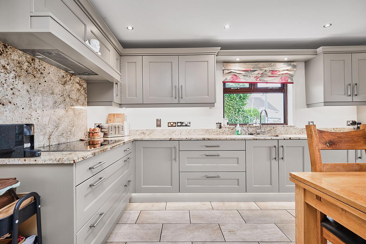 With 'Blanco' stainless steel sink unit, high and low level built in units with under unit lighting set in granite worktops, upstands and sills, integrated 'Bosch' ceramic hob, canopy style concealed extractor fan above, 'Bosch' double eye level ovens, 'Neff' warming drawer, space for American style fridge freezer, integrated dishwasher, pull out larder cupboard, additional shelved cupboard, saucepan drawers, drawer banks, larder cupboard, recessed lighting in pelmets, recessed lighting in ceiling, part wood panelled walls and tiled floor.