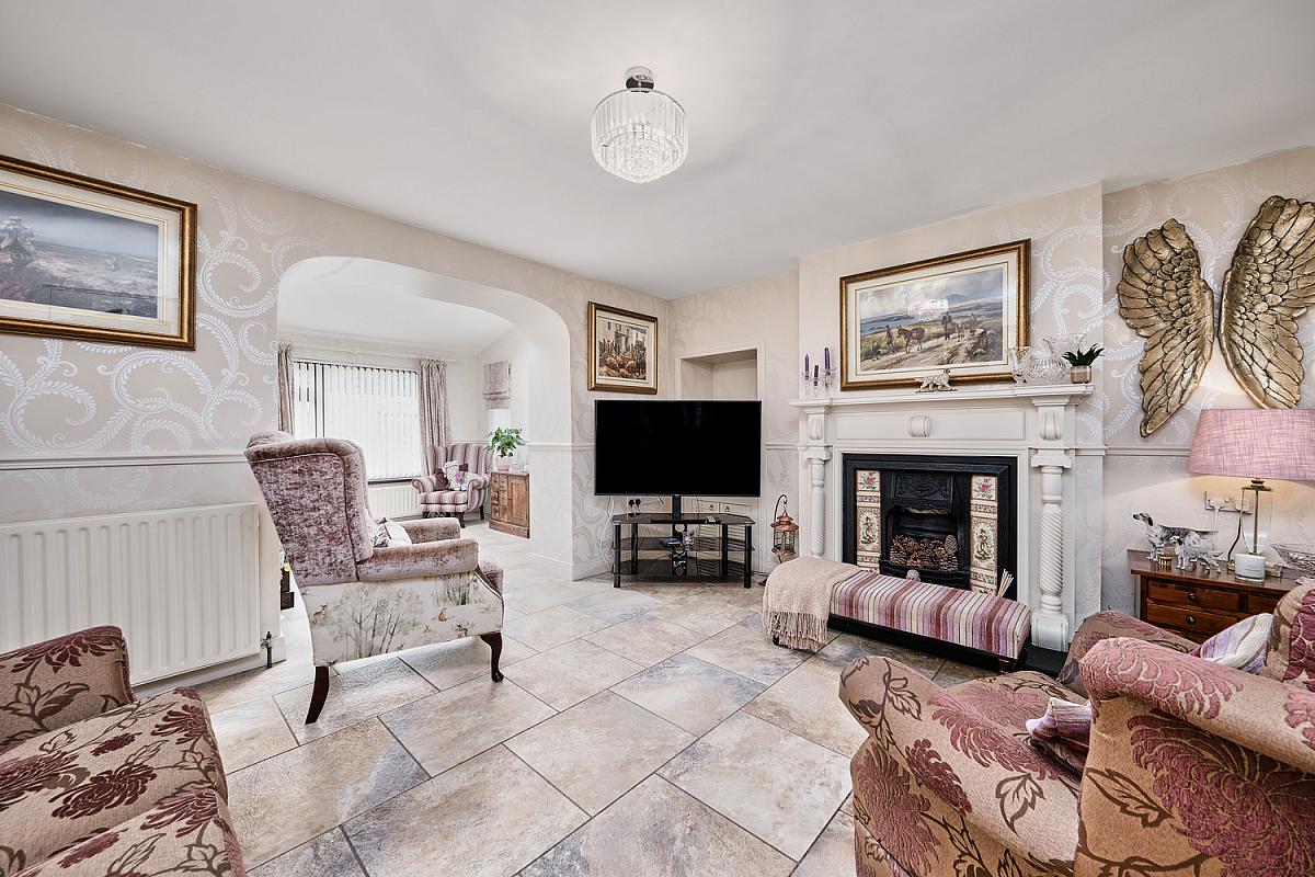 With wood surround fireplace with cast iron tiled inset, slate hearth, railed storage cupboard, dado rail, tiled floor and open archway through to:
