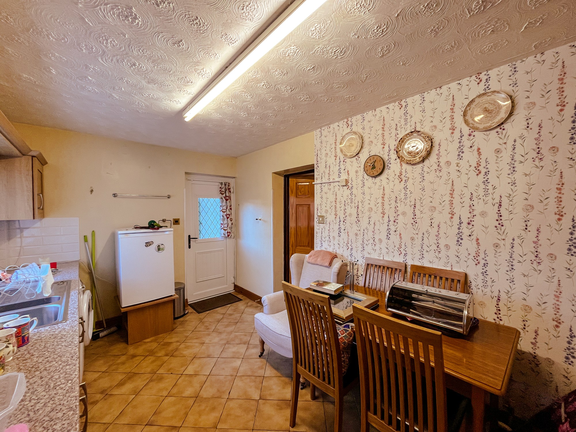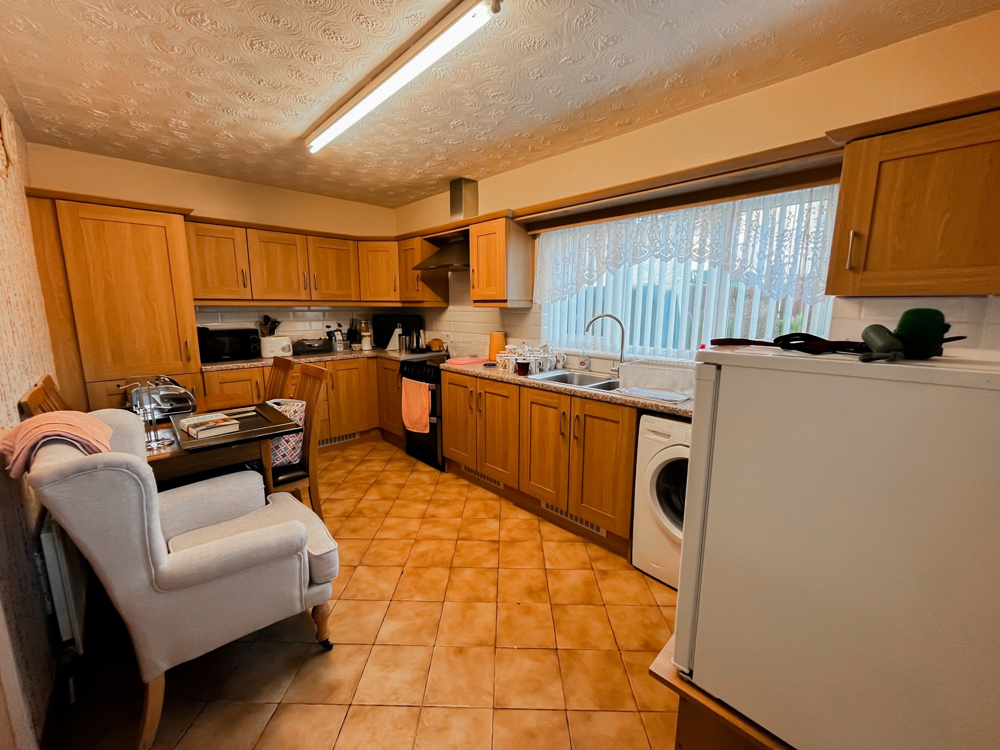 With bowl and a half stainless steel sink unit, eye and low level units, extractor fan, plumbed for automatic dishwasher and tiled flooring.