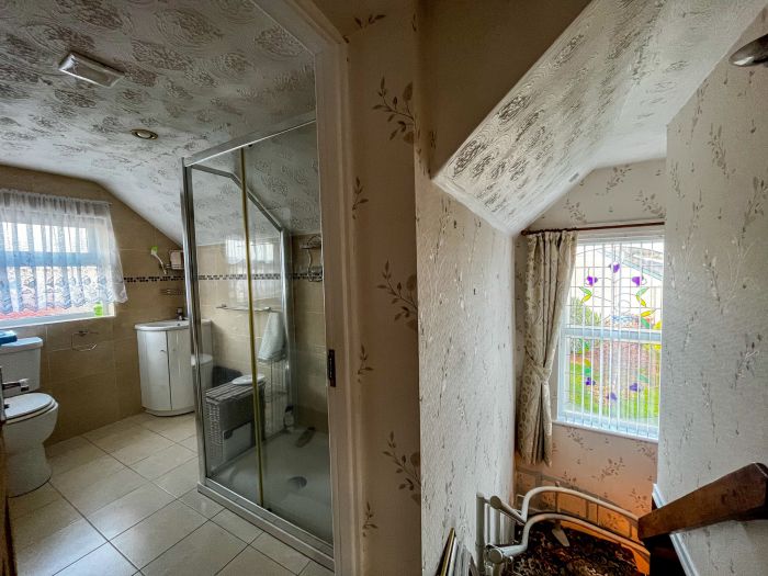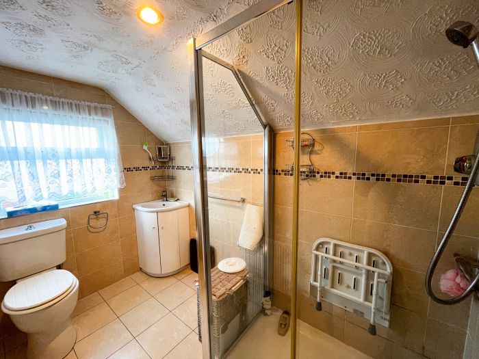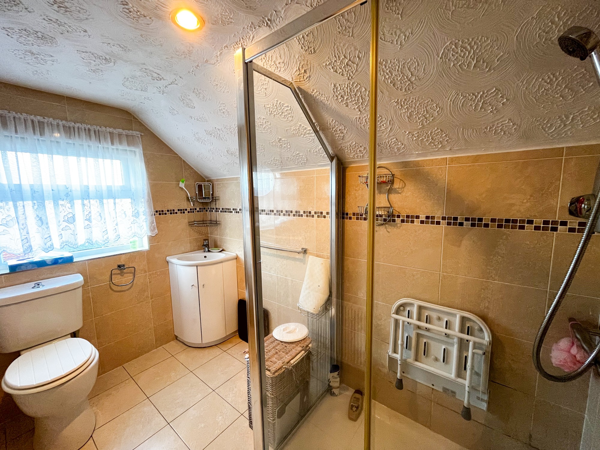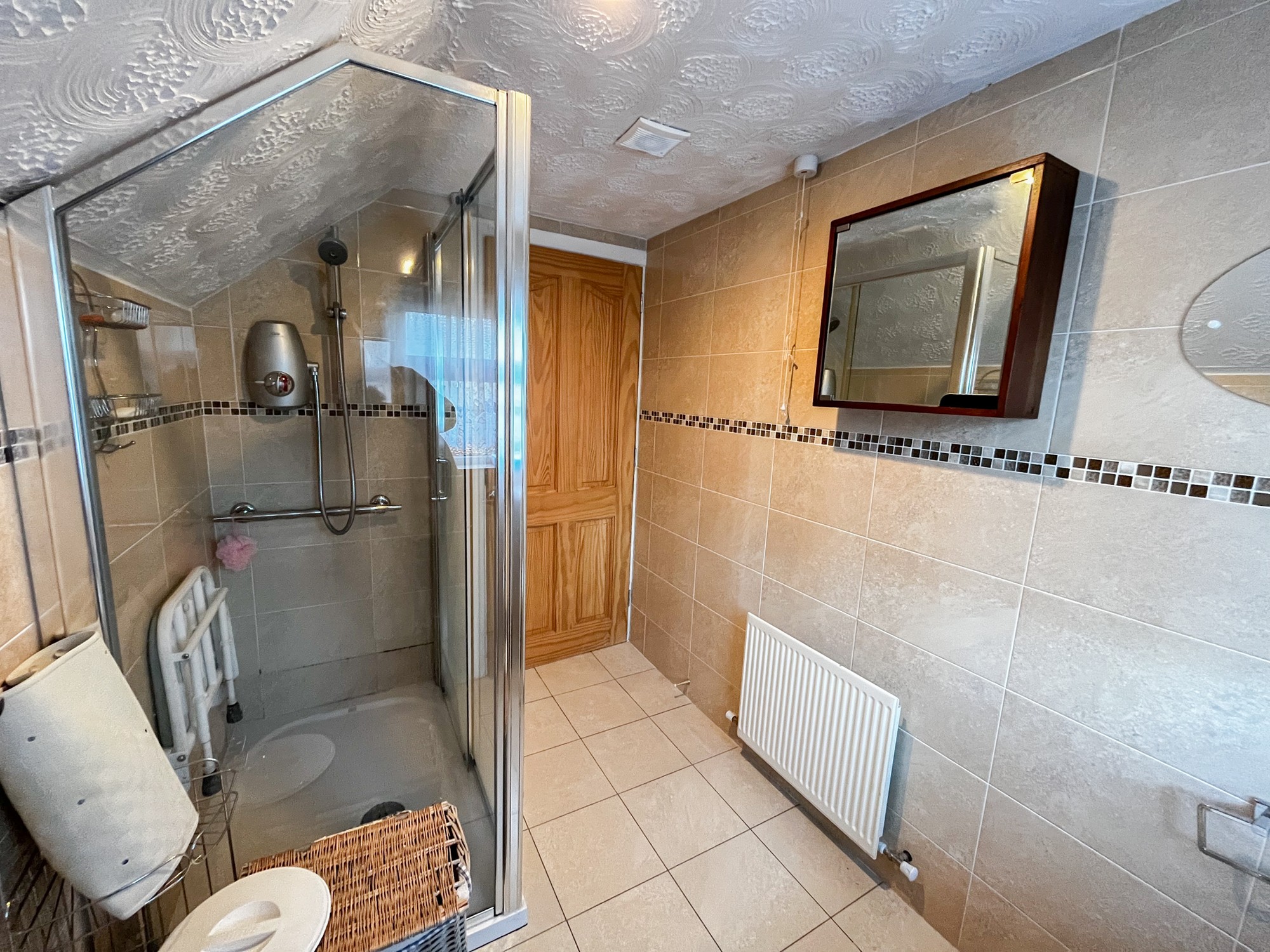 With walk in electric "Aqua Stream" shower, W.C., vanity basin, tiled flooring, extractor fan, eyeball lighting and fully tiled walls.