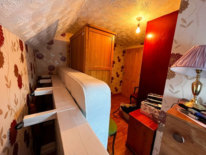 With wooden flooring, tiled fireplace, mantle board, T.V shelf, book shelves and points for wall lights.