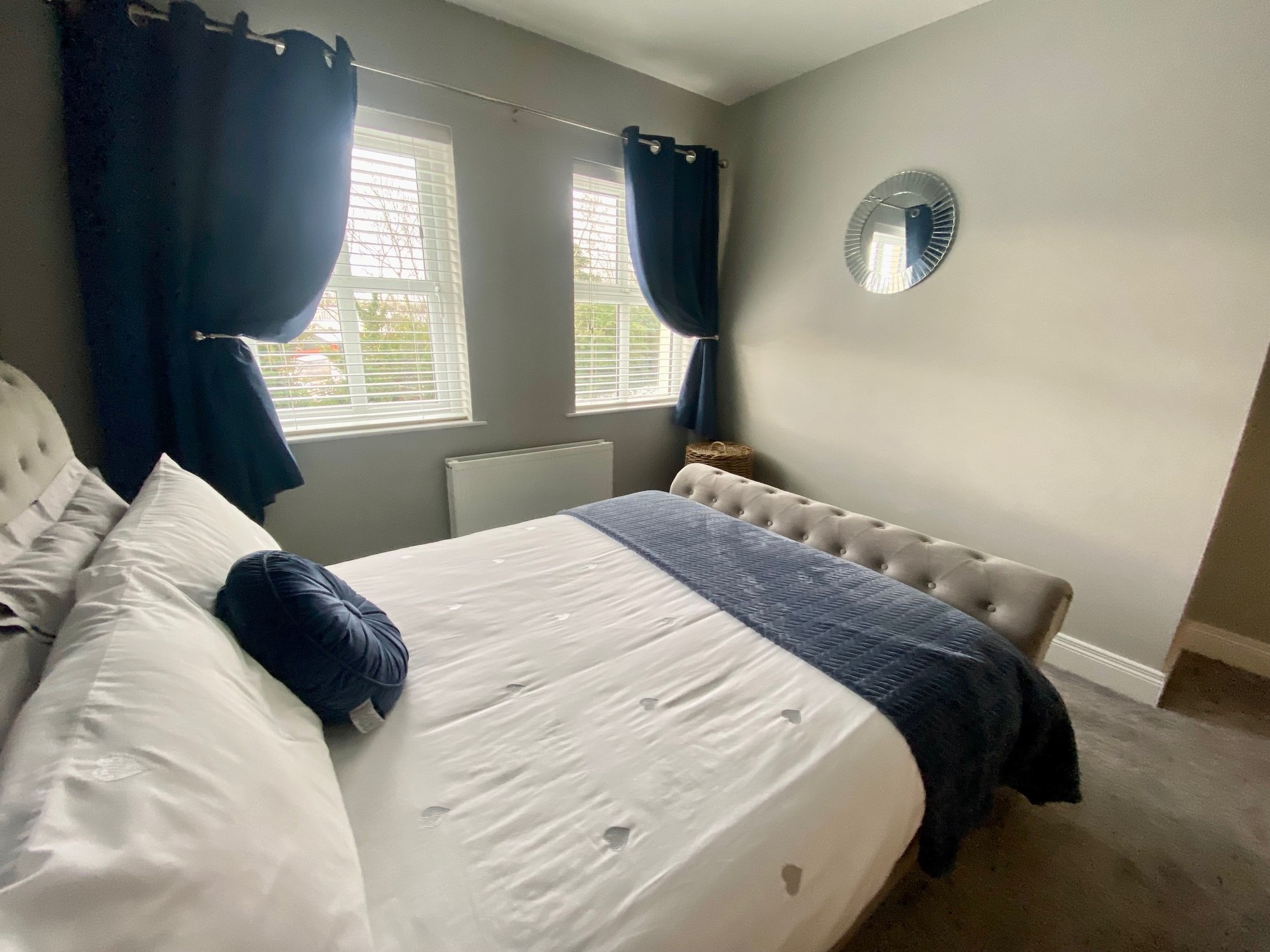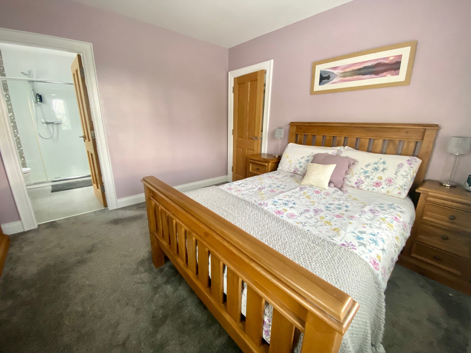 Features spacious ensuite with double walk in shower unit, vanity basin, WC, LED mirror, heated towel rail, eyeball lighting, fully tiled walls and tiled flooring.