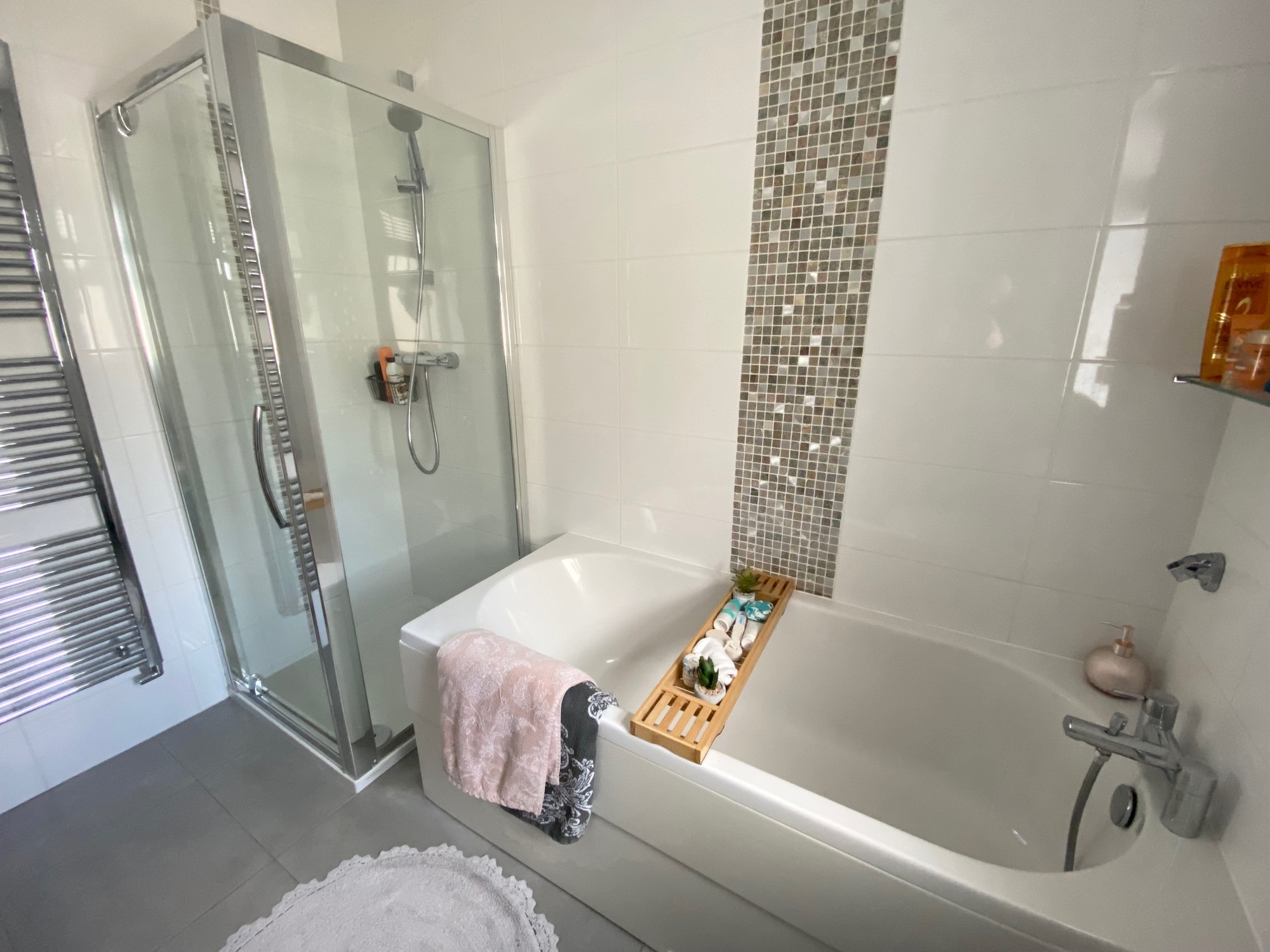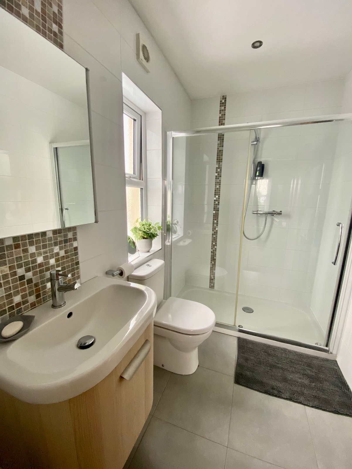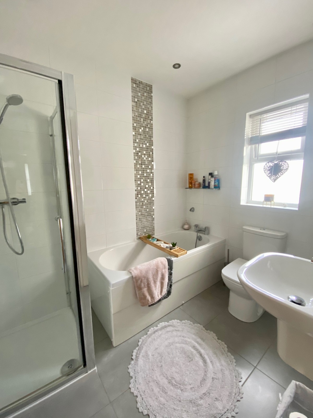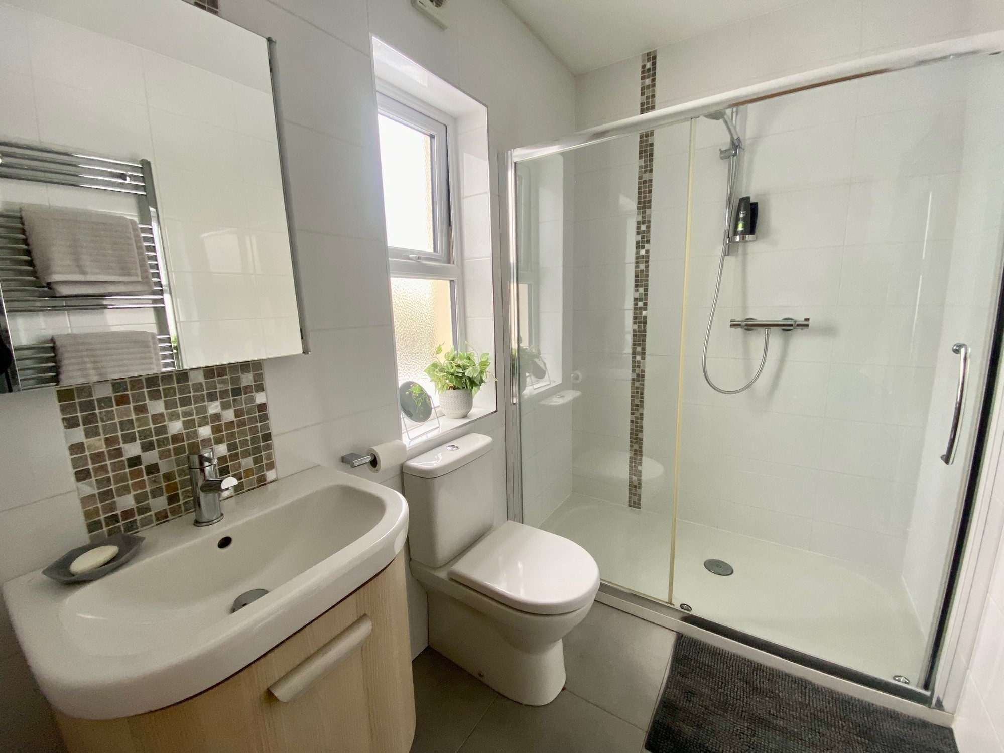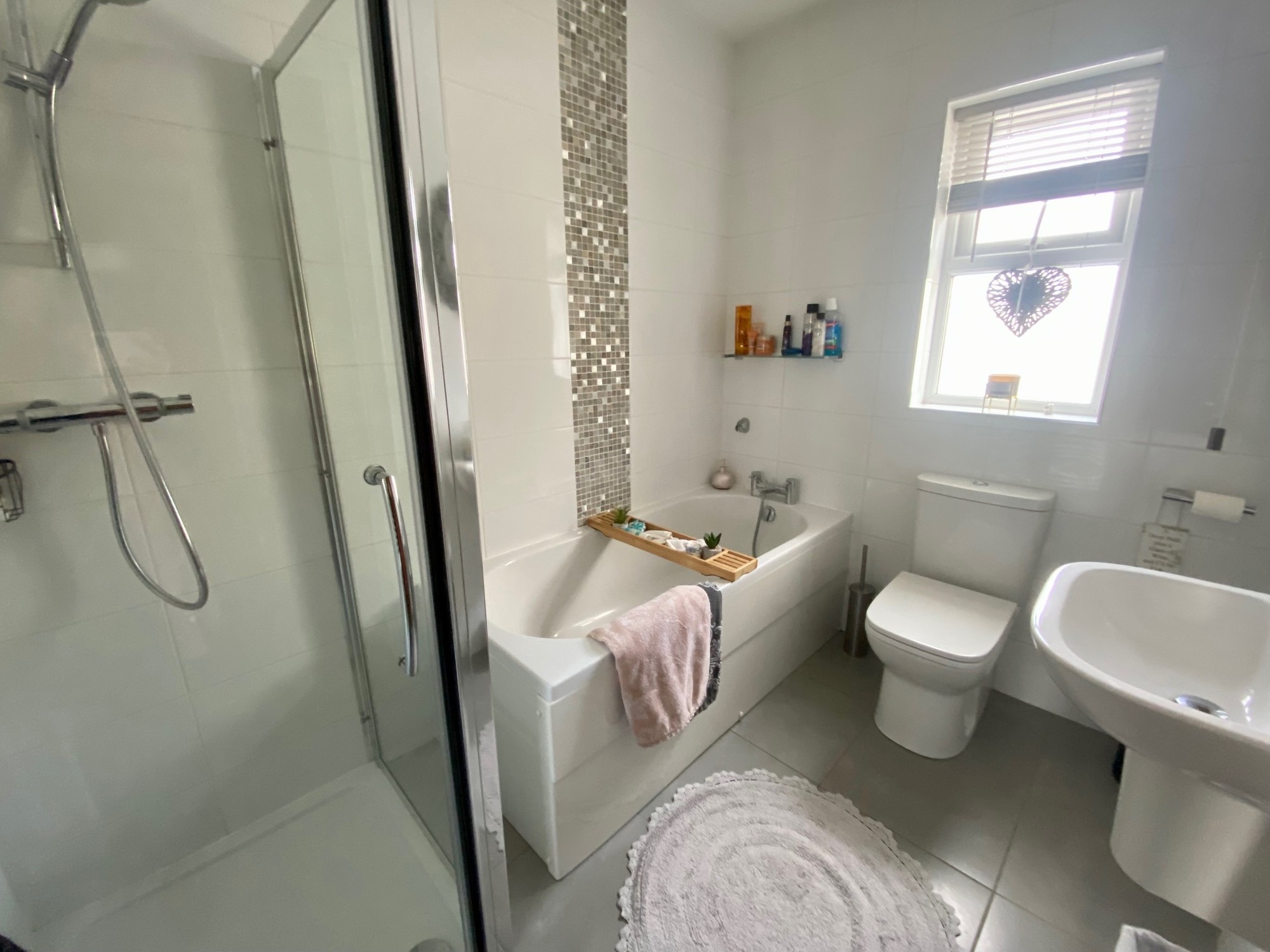 Includes shower cubicle with thermostatic shower, telephone hand shower over bath, WC, wash hand basin, heated towel rail, eyeball lighting, fully tiled walls and tiled flooring.