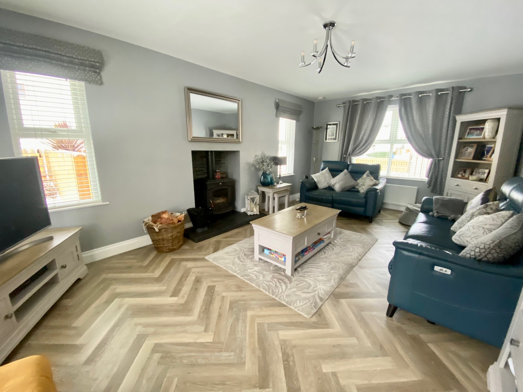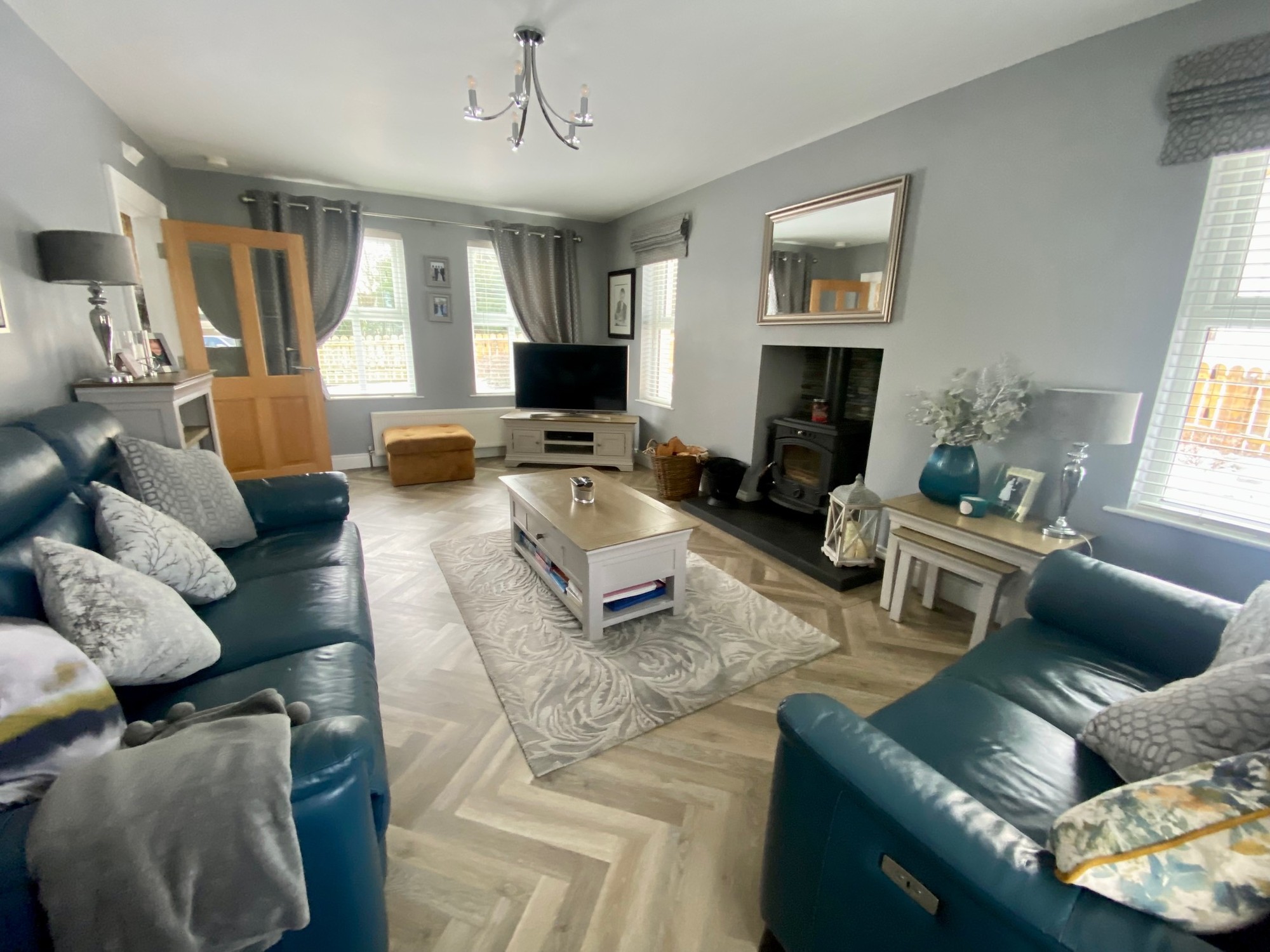 Including multi-fuel burning stove, tiled hearth, TV point, dual aspect windows, part glass paneled door and ‘Karndean’ flooring.