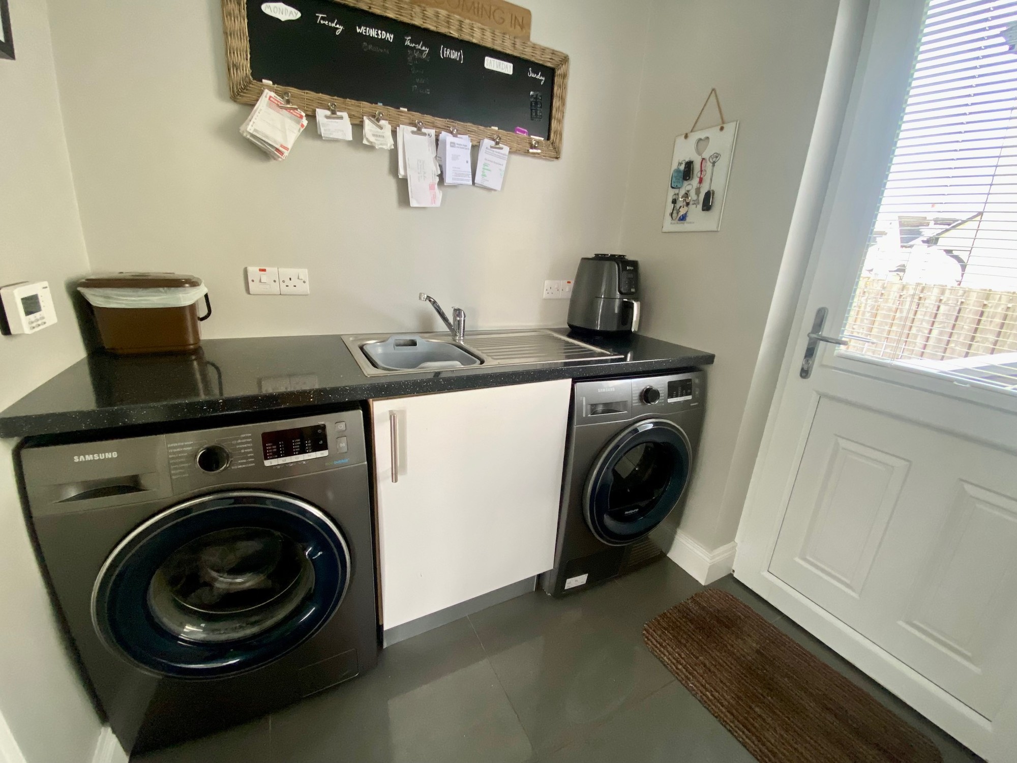 With stainless steel sink unit, worktop, plumbed for automatic washing machine, space for dryer and ceramic tiled flooring.
