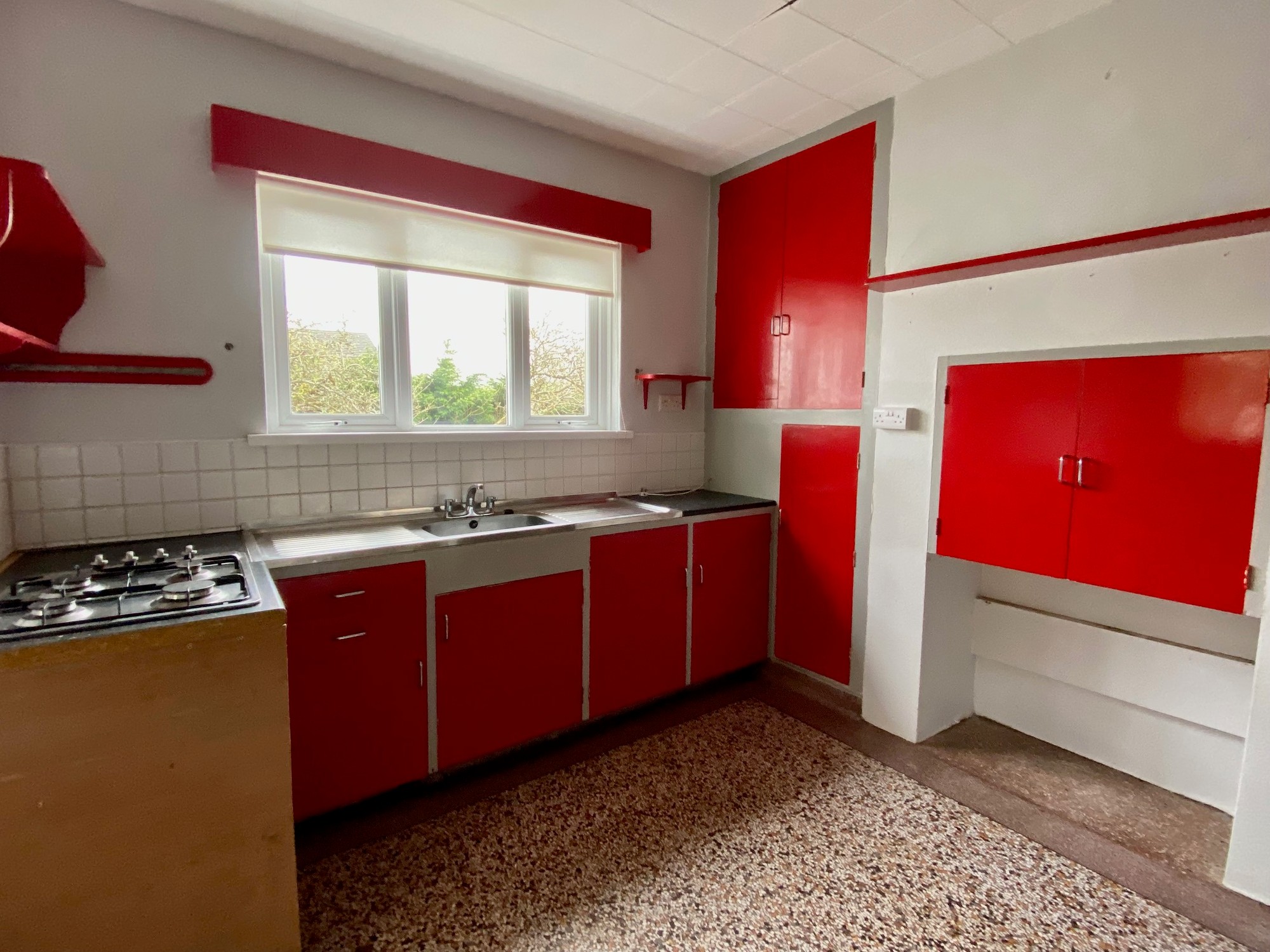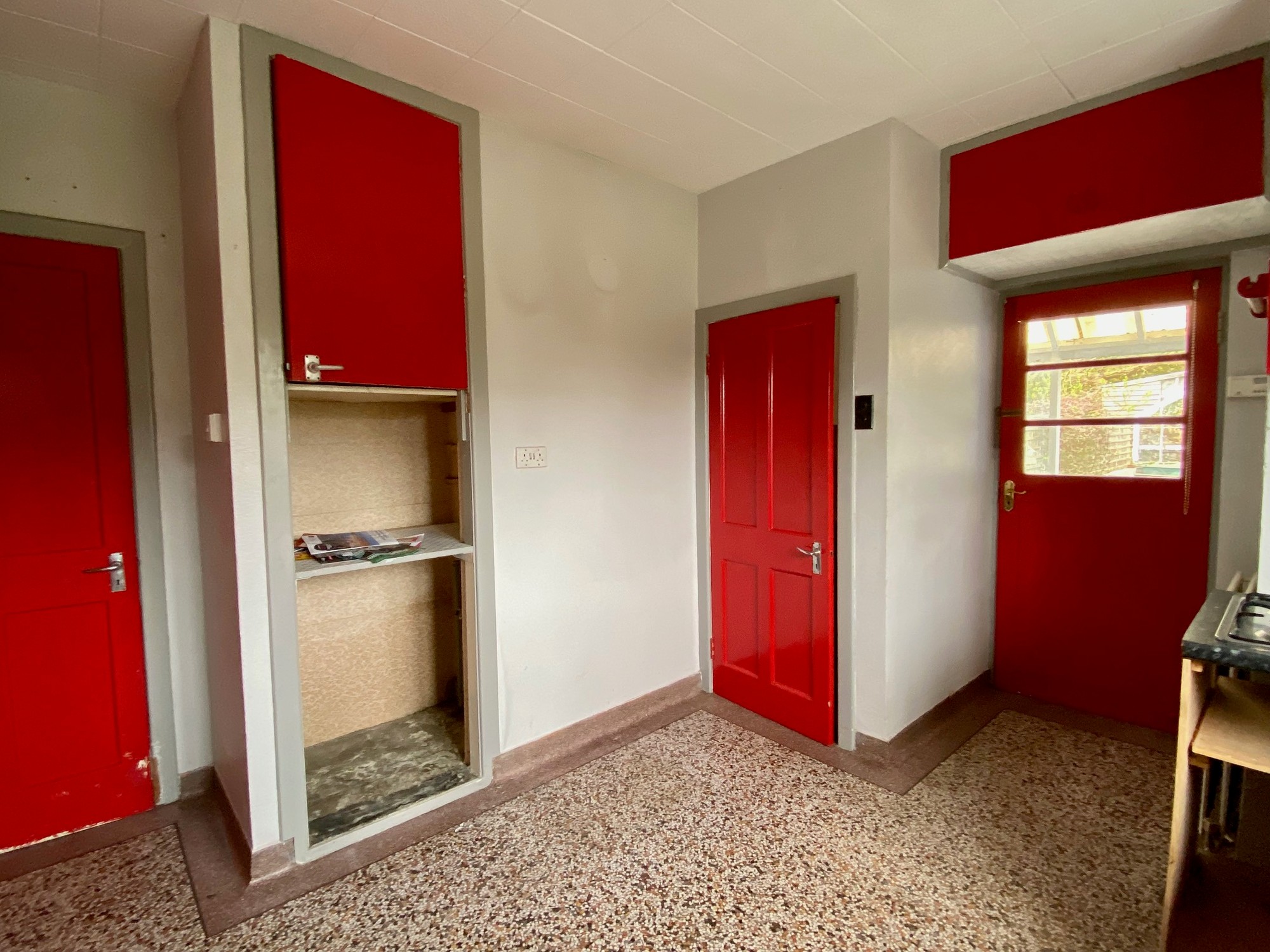 Fitted kitchen units, stainless steel sink unit, gas hob, extractor fan, tiled around work top, pantry, and Terrazzo flooring.