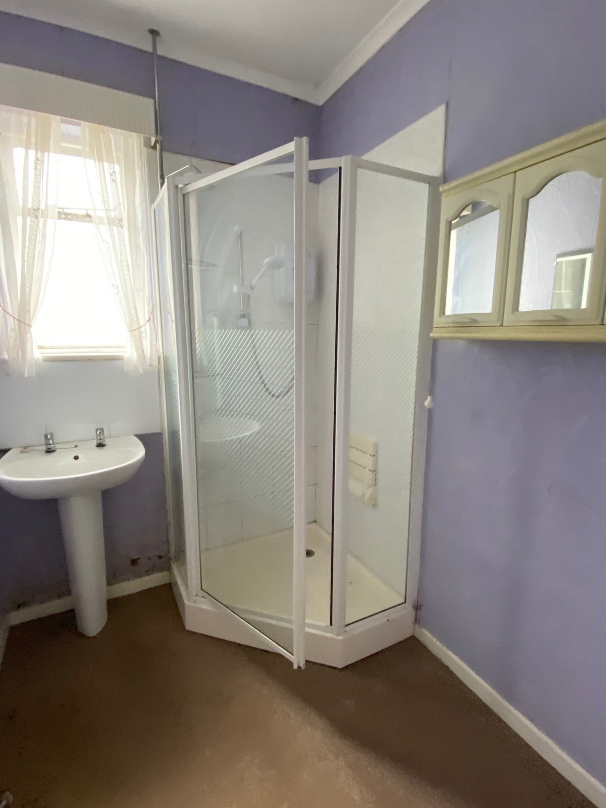 With ‘Triton’ electric shower, wash hand basin and shaver light.