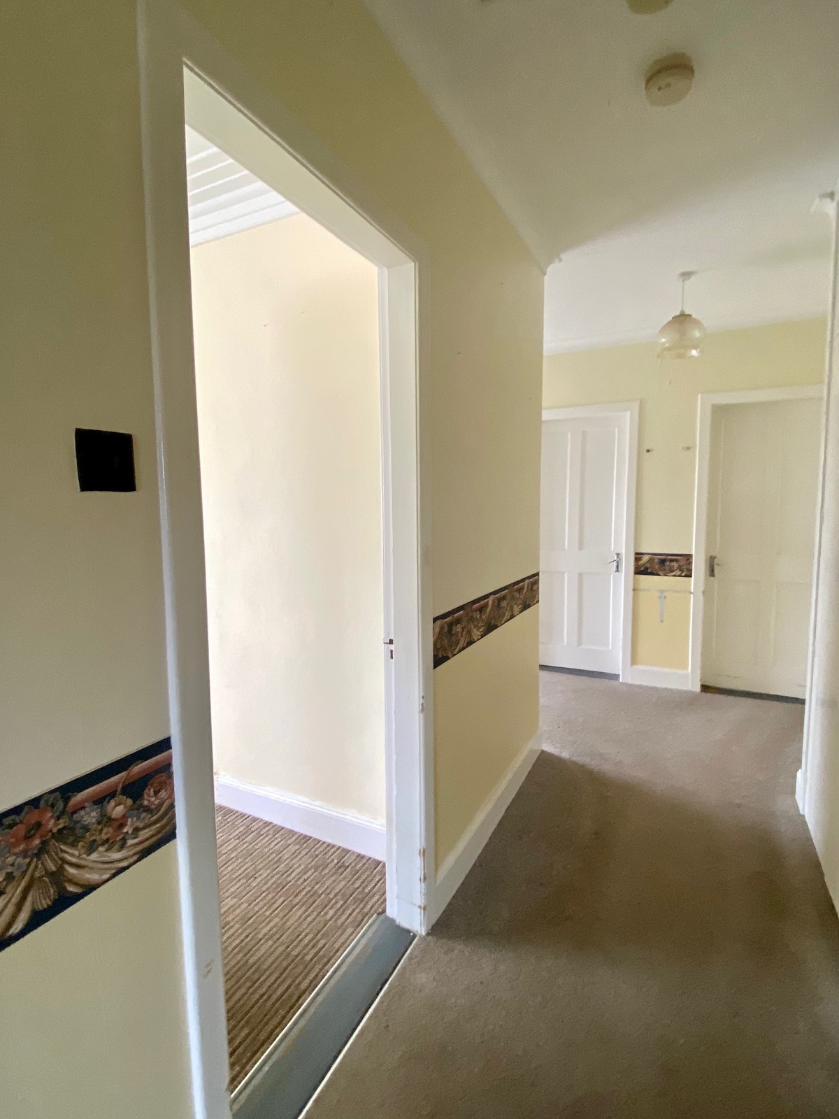 With walk in cloaks, double shelved storage cupboard and coved ceiling,