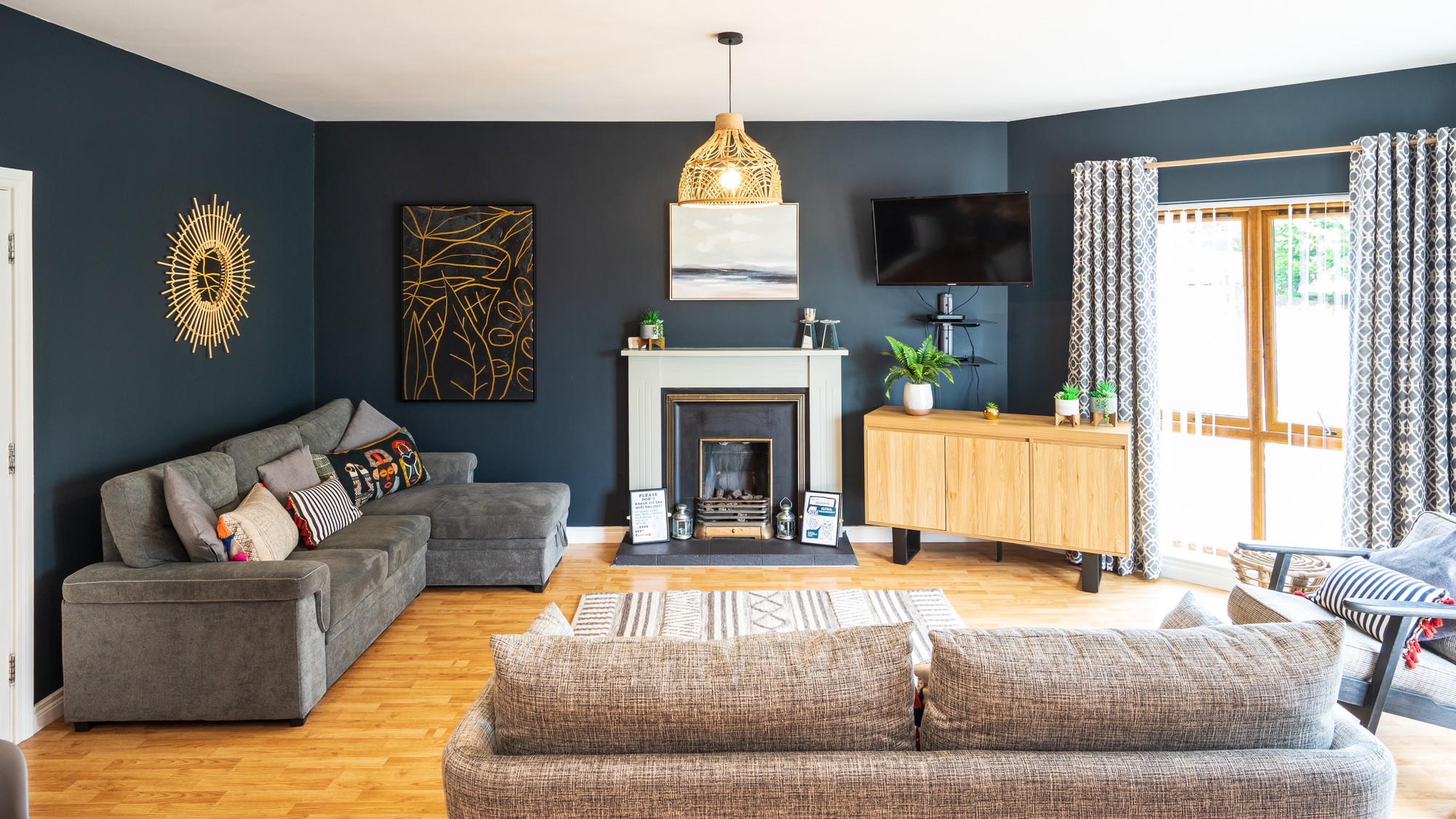 Features attractive fireplace with black tiled hearth, Television point and wooden flooring.