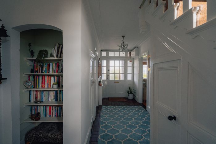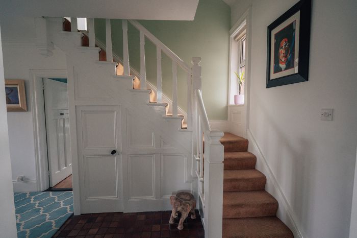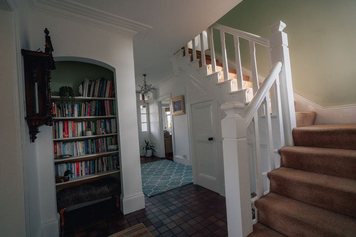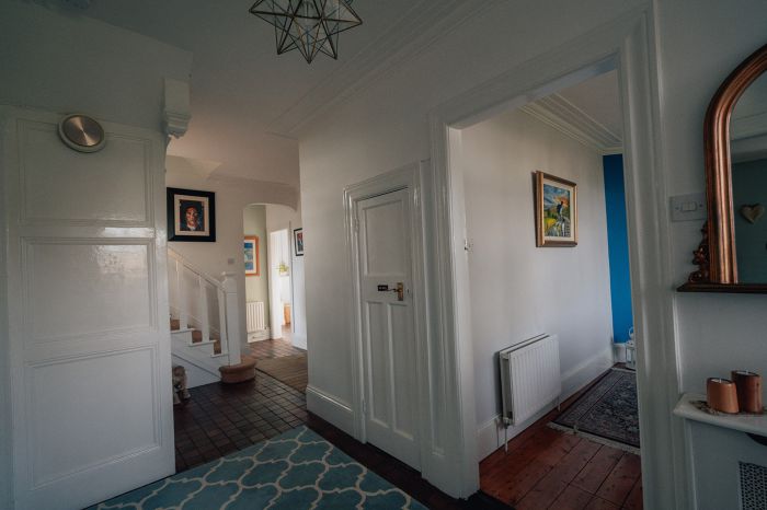 Spacious hallway with built in storage and hotpress, original stone floor, panelled doors and feature cornice.