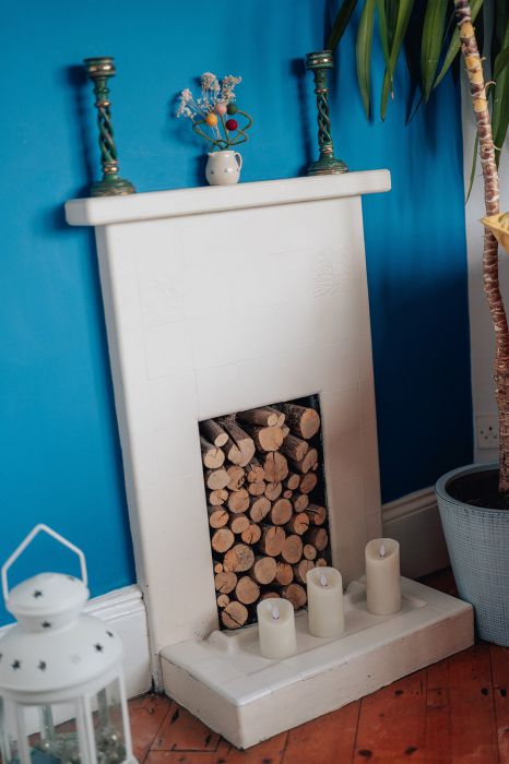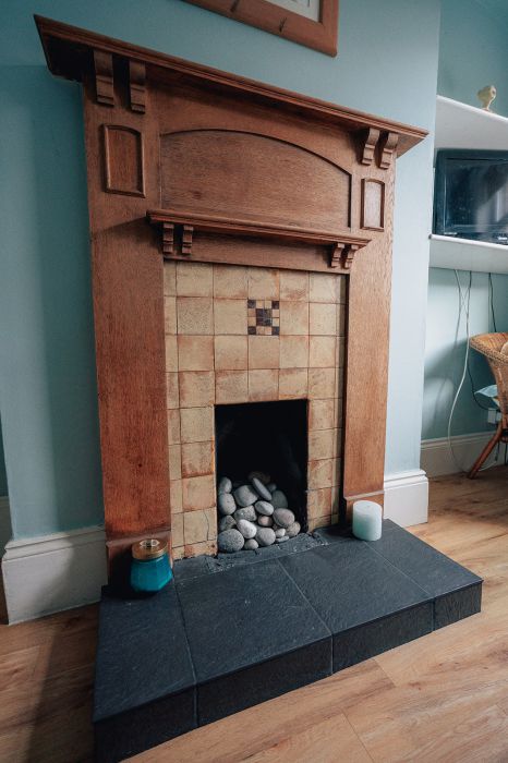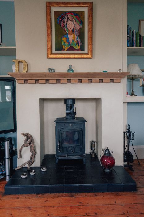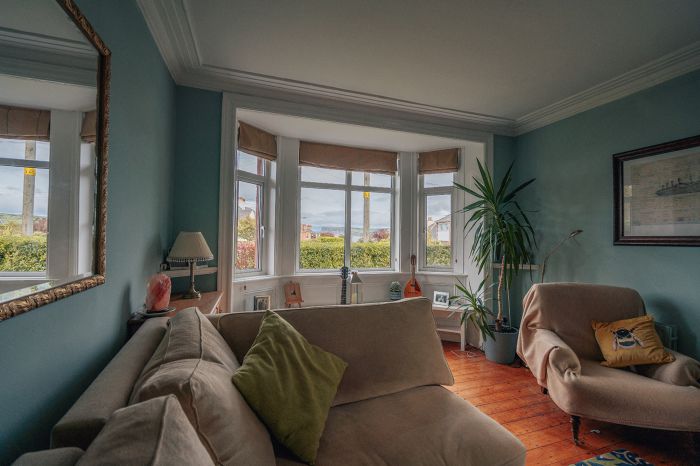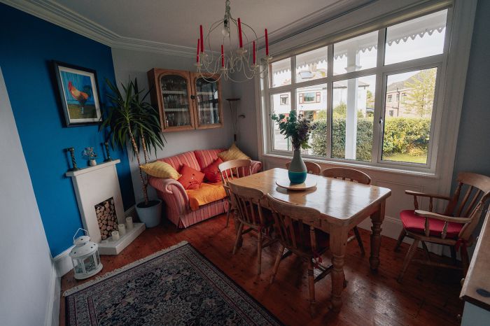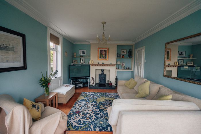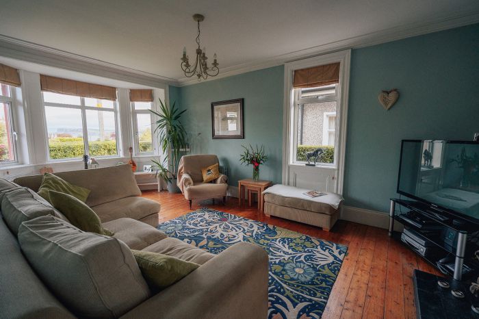 Includes wood burning stove with black tiled hearth and wooden mantle, wooden flooring and feature bay window with wood panelling detail and views towards Ballycastle seafront and Fairhead.