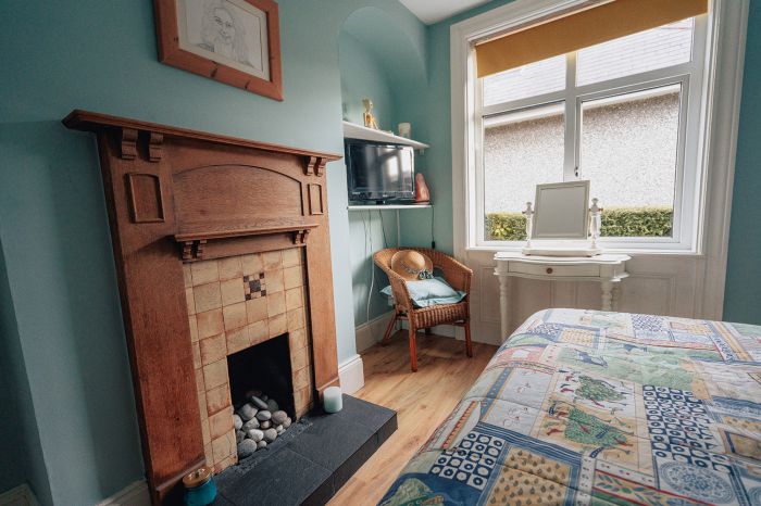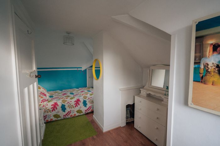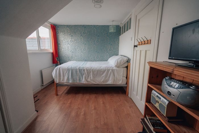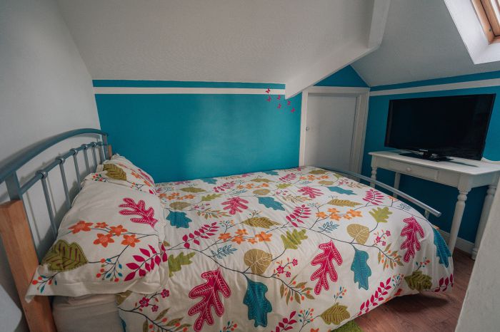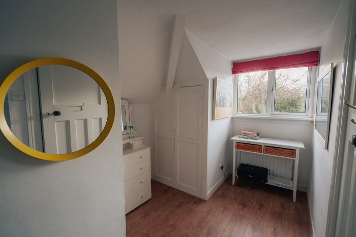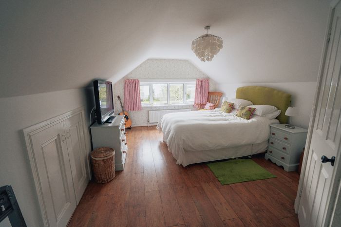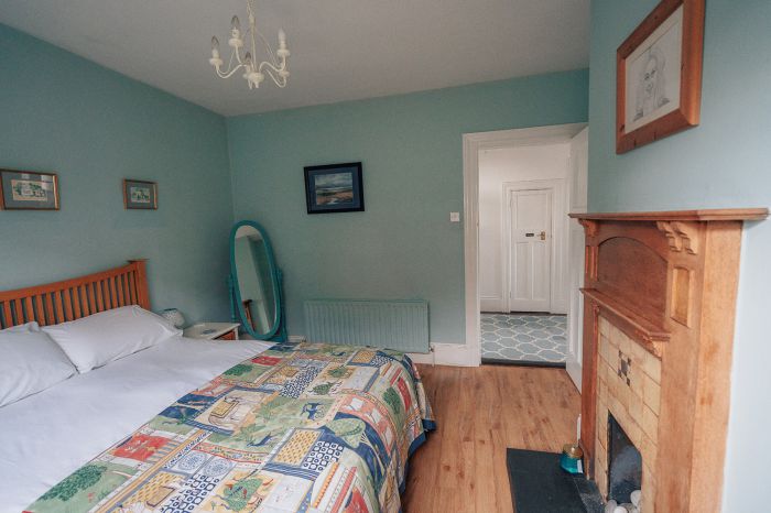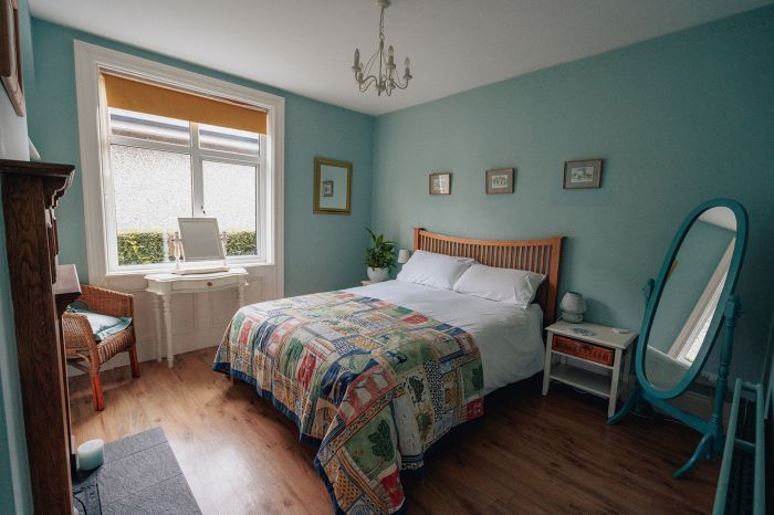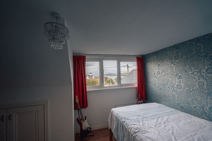 Double bedroom with views towards Knocklayde Mountain, under eaves storage and wooden flooring. Double bedroom with stunning views towards Ballycastle beach and Fairhead.