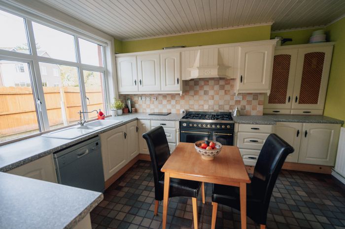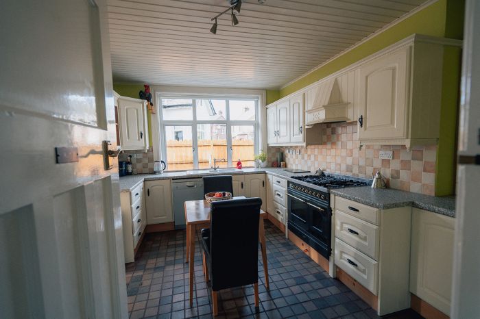 Includes a range of fully fitted traditional style eye and low level kitchen units, range style gas cooker with electric oven, extractor fan, dishwasher, bowl and half sink unit with traditional style mixer tap, wooden panelled ceiling and tiled flooring.