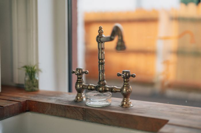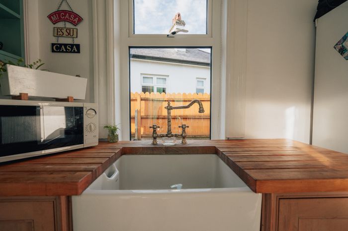 With low level pine units and Belfast sink with traditional style mixer taps.