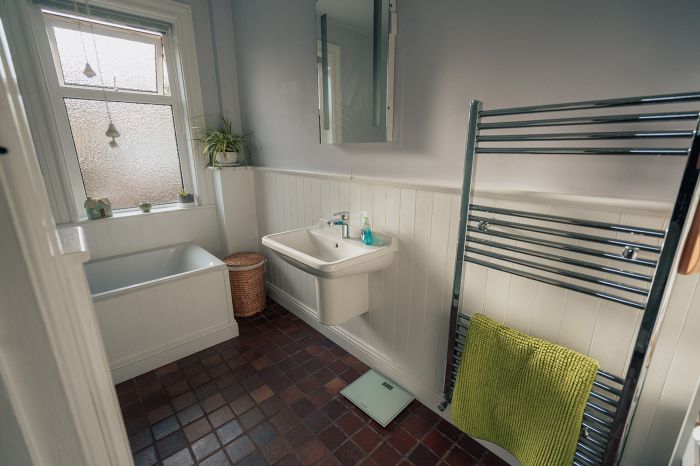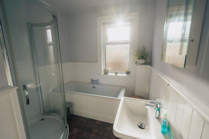Features corner shower cubicle with ‘Mira Sport’ electric shower, bath with side mixer taps, wash hand basin, heated towel and part panelled walls.
