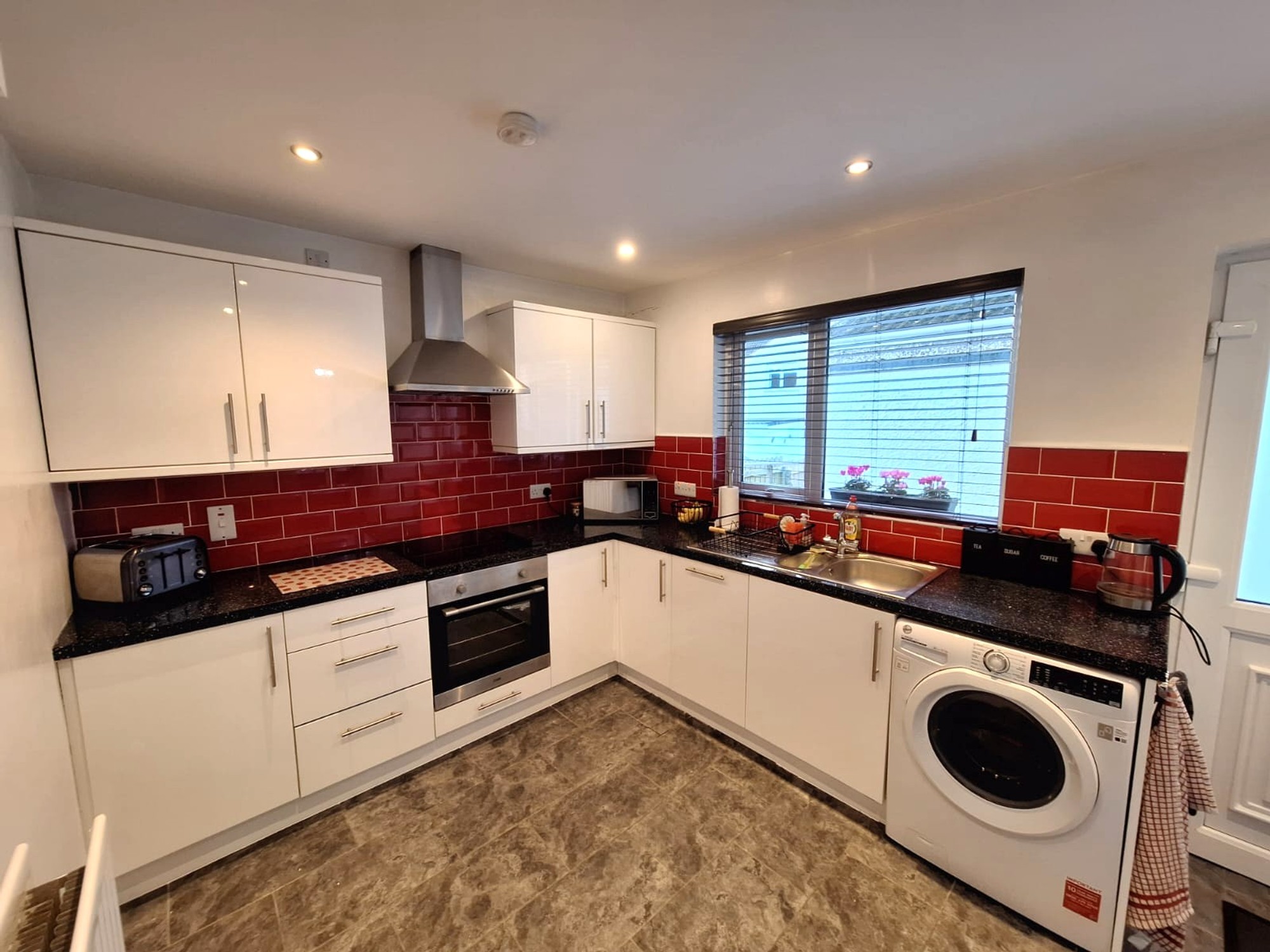 Attractive eye and low level units, plumbed for an automatic washing machine, bowl and a half stainless steel sink unit, "Logik" under oven, ceramic hob, stainless steel extractor fan, integrated dishwasher.