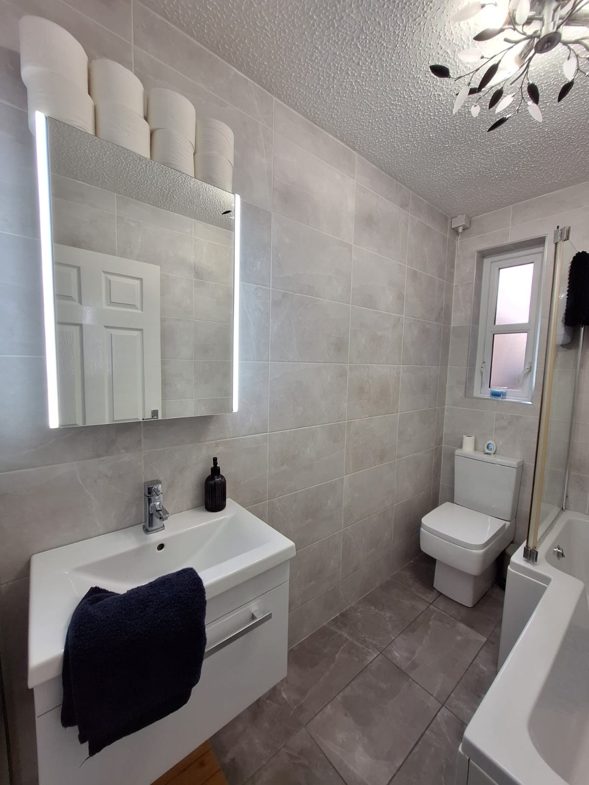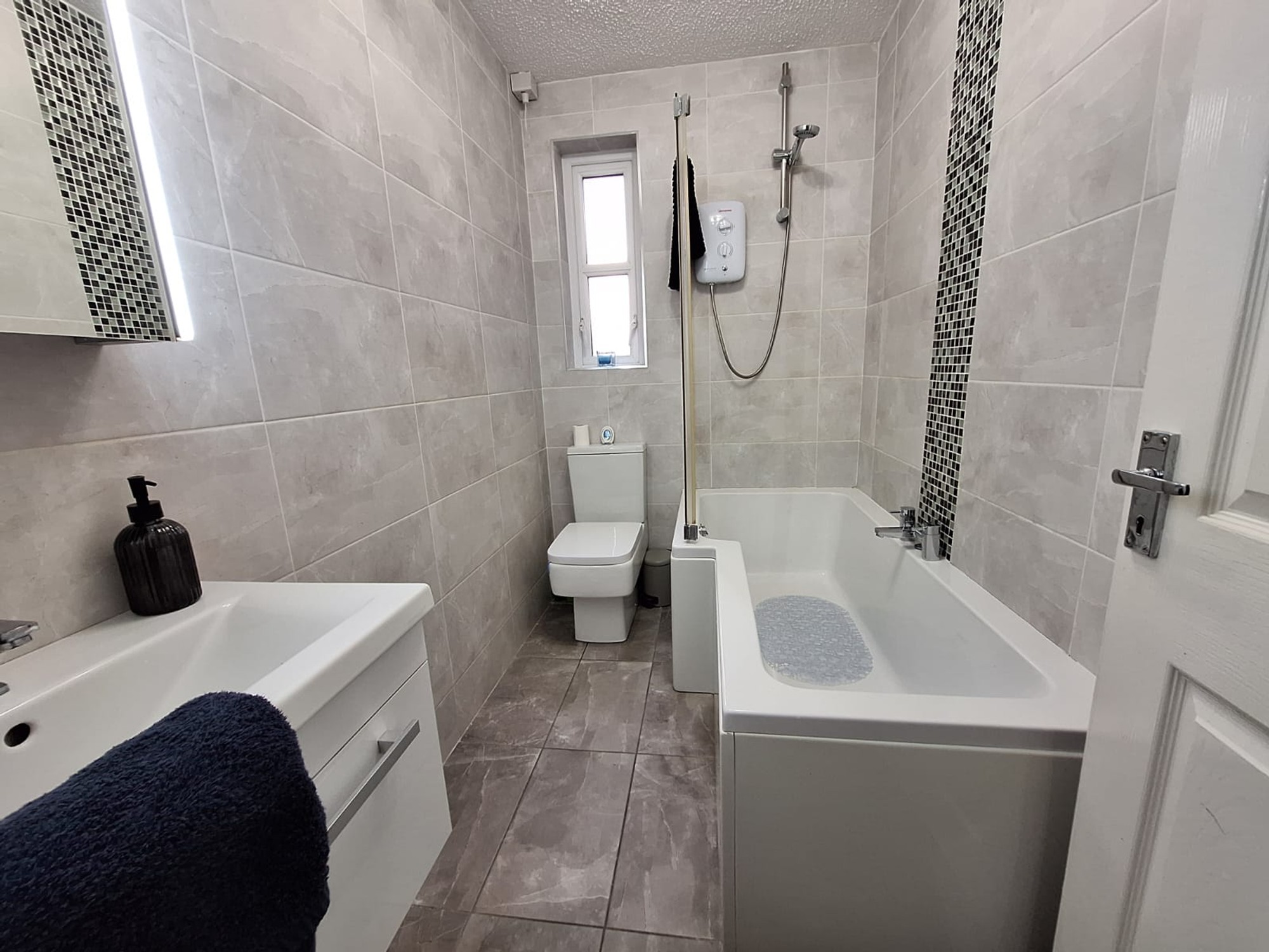 Fully tiled walls and tiled flooring, Redring Expressions electric shower unit, bath, WC, vanity basin, LED mirror.