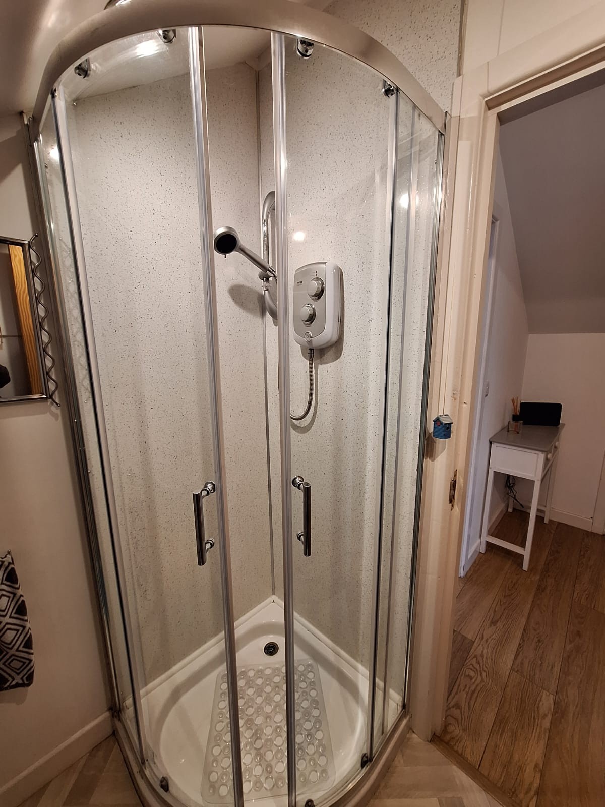 Wash hand basin, "Triton" electric shower over bath, fully tiled around bath, fitted wall mirror, eyeball lighting, tiled floor, linen cupboard.