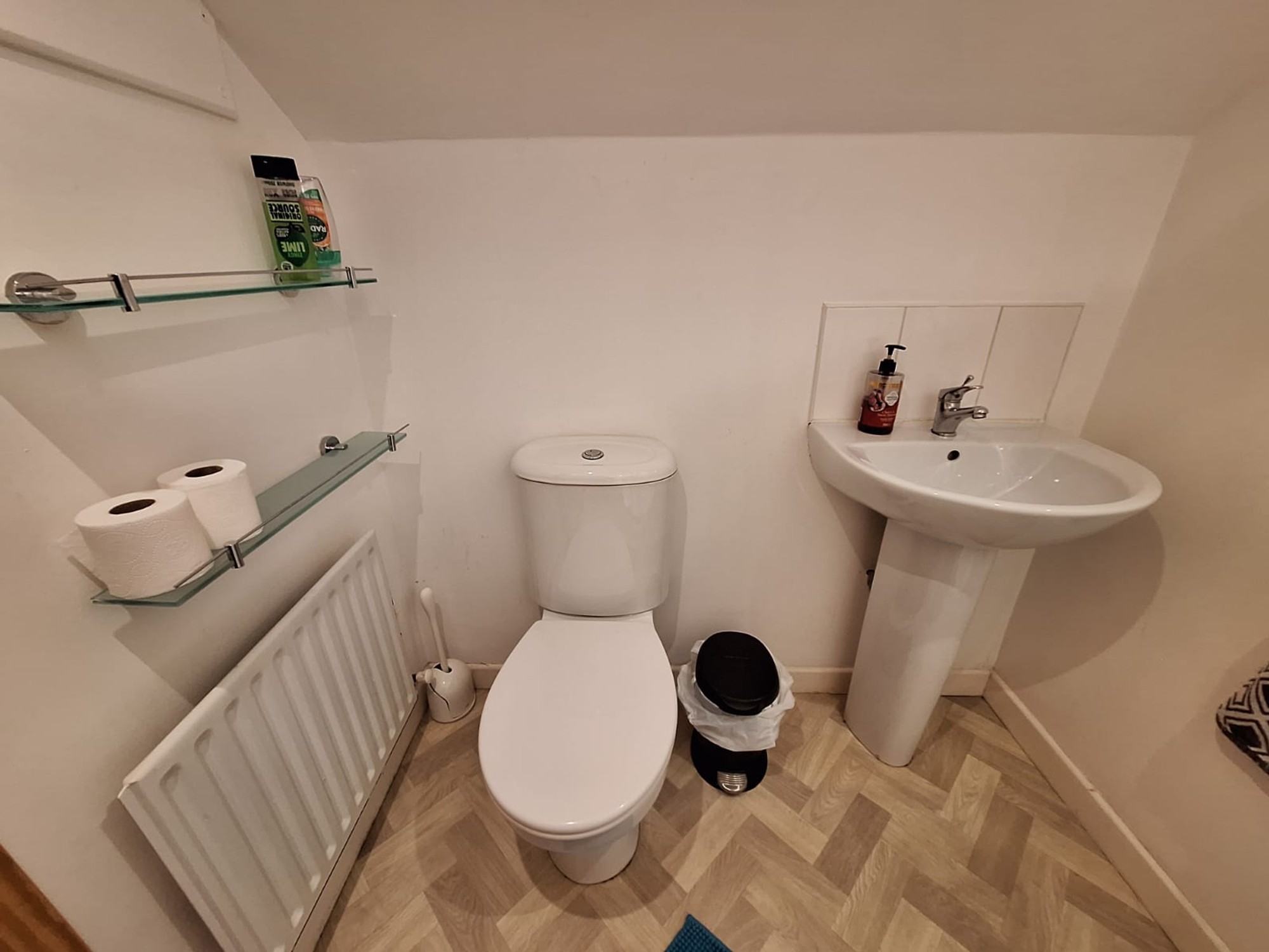 With corner shower cubicle with "Triton" electric shower, WC, wash hand basin, tiled splashback.