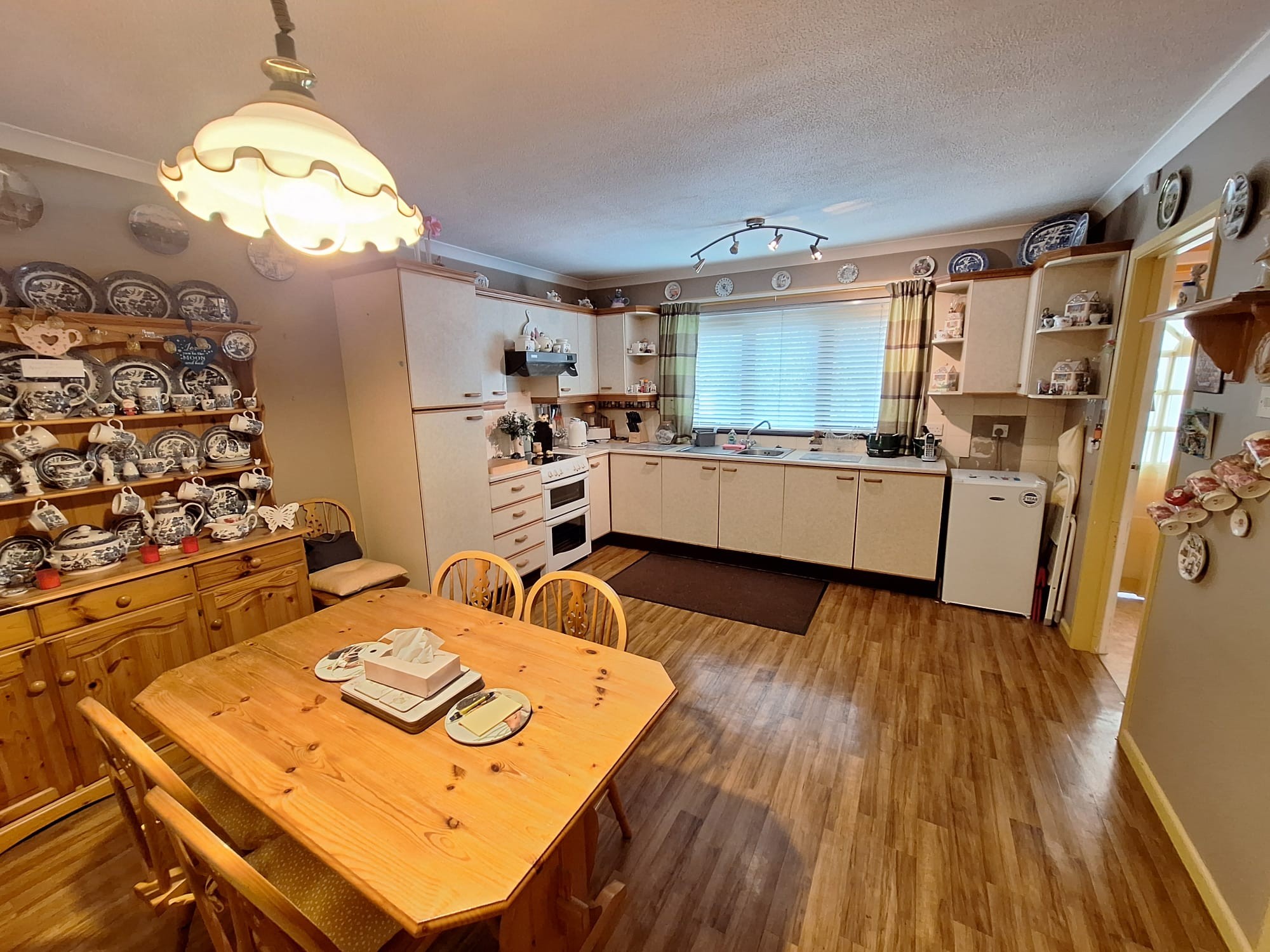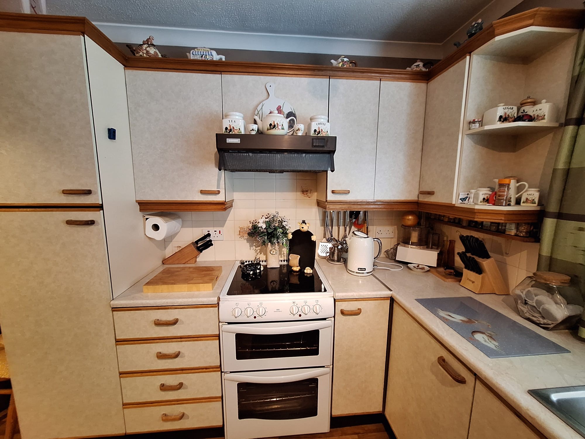 Extensive range of eye and low level units, corner display unit, stainless steel sink unit, "New World" double oven, "Siemens" extractor fan, larder unit, coved ceiling, glass panelled door to: