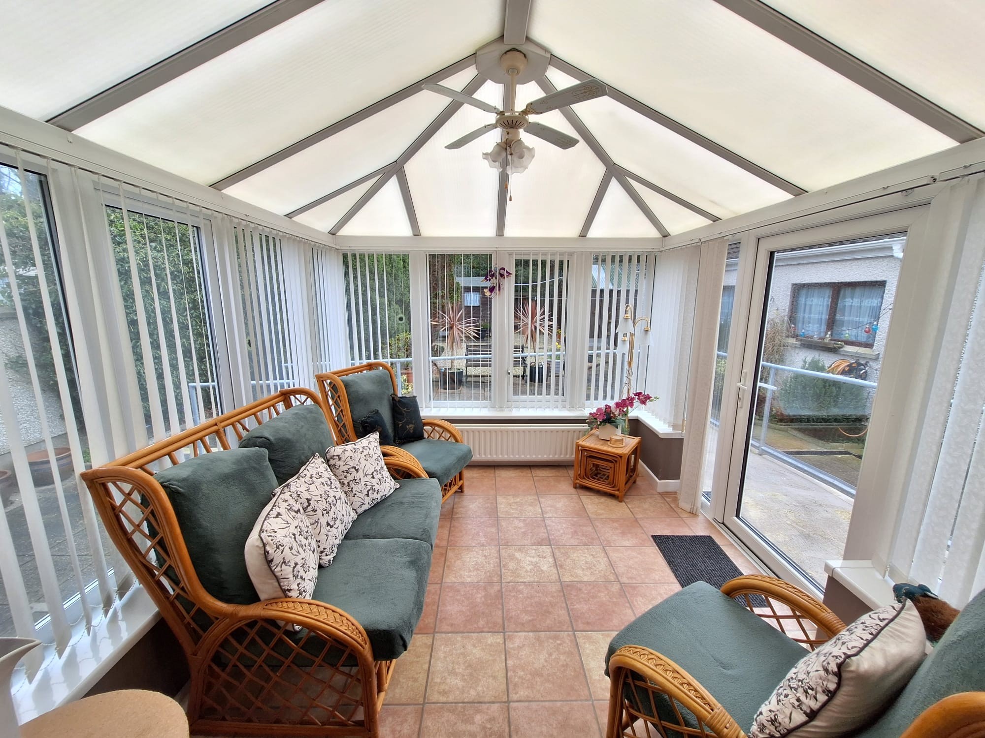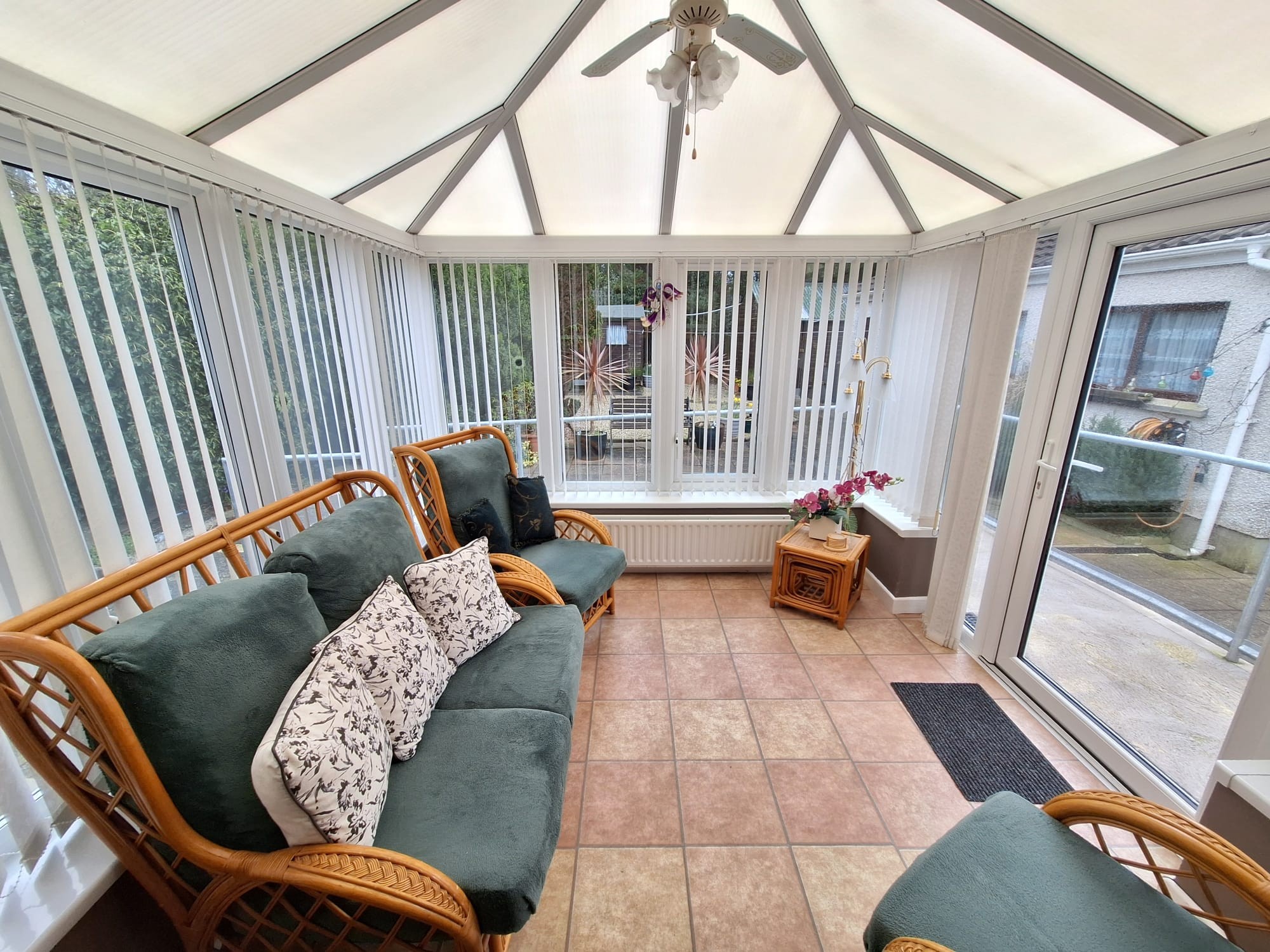 Door to the rear patio and garden area, tiled floor, views overlooking the rear garden area.