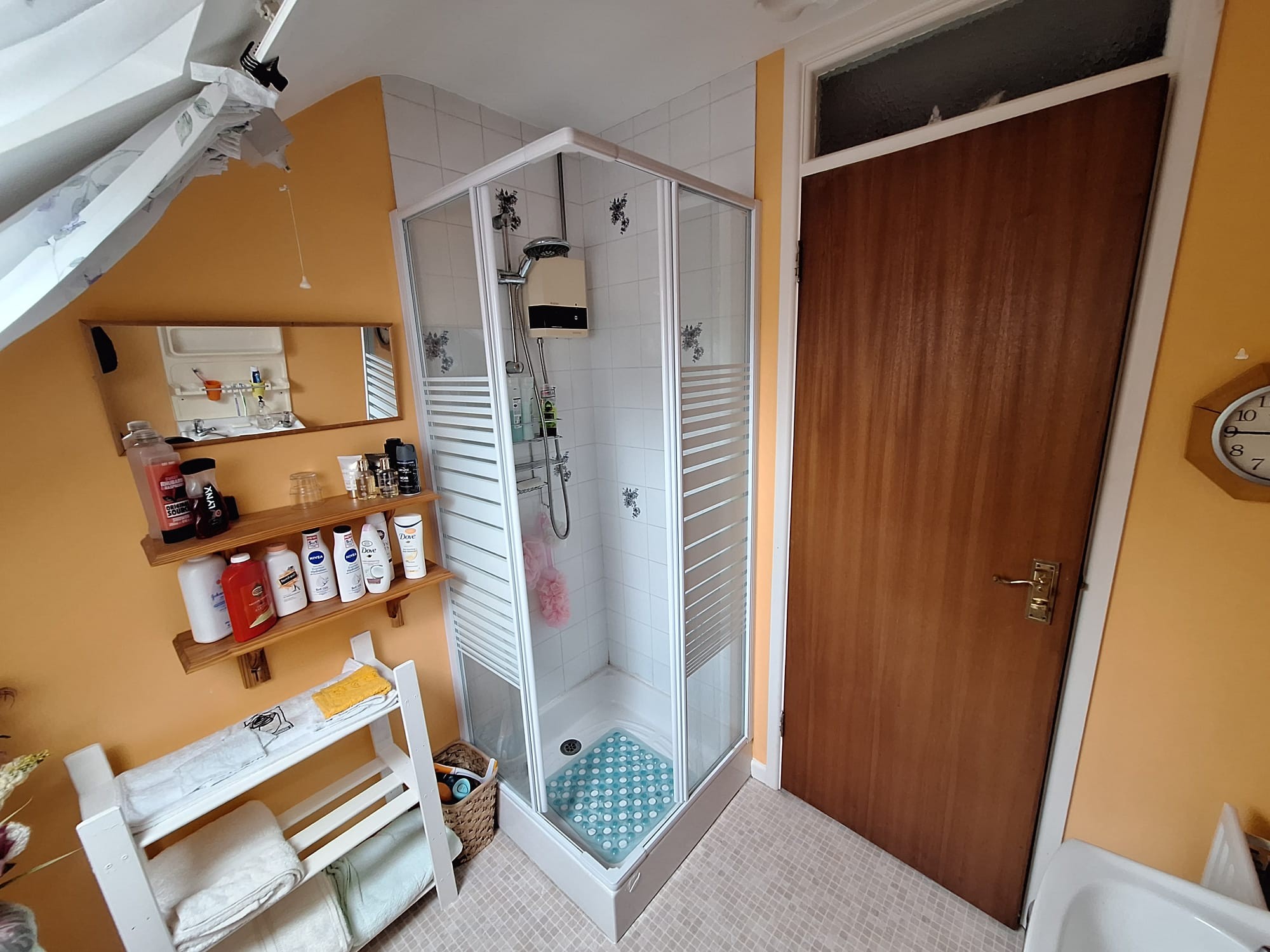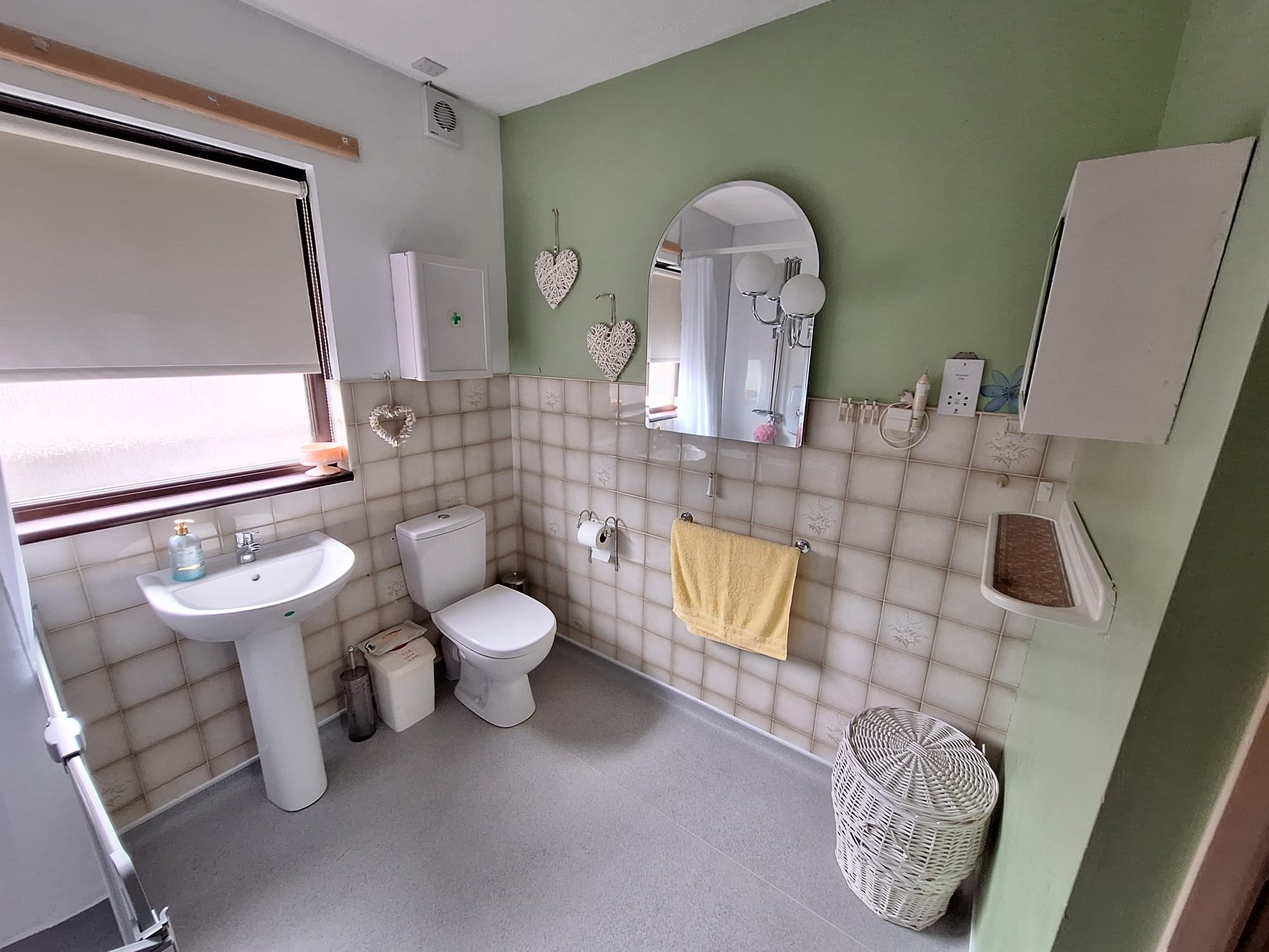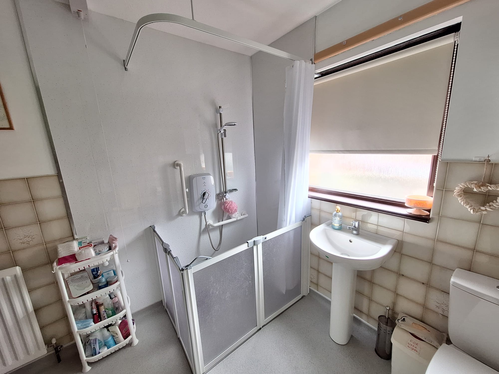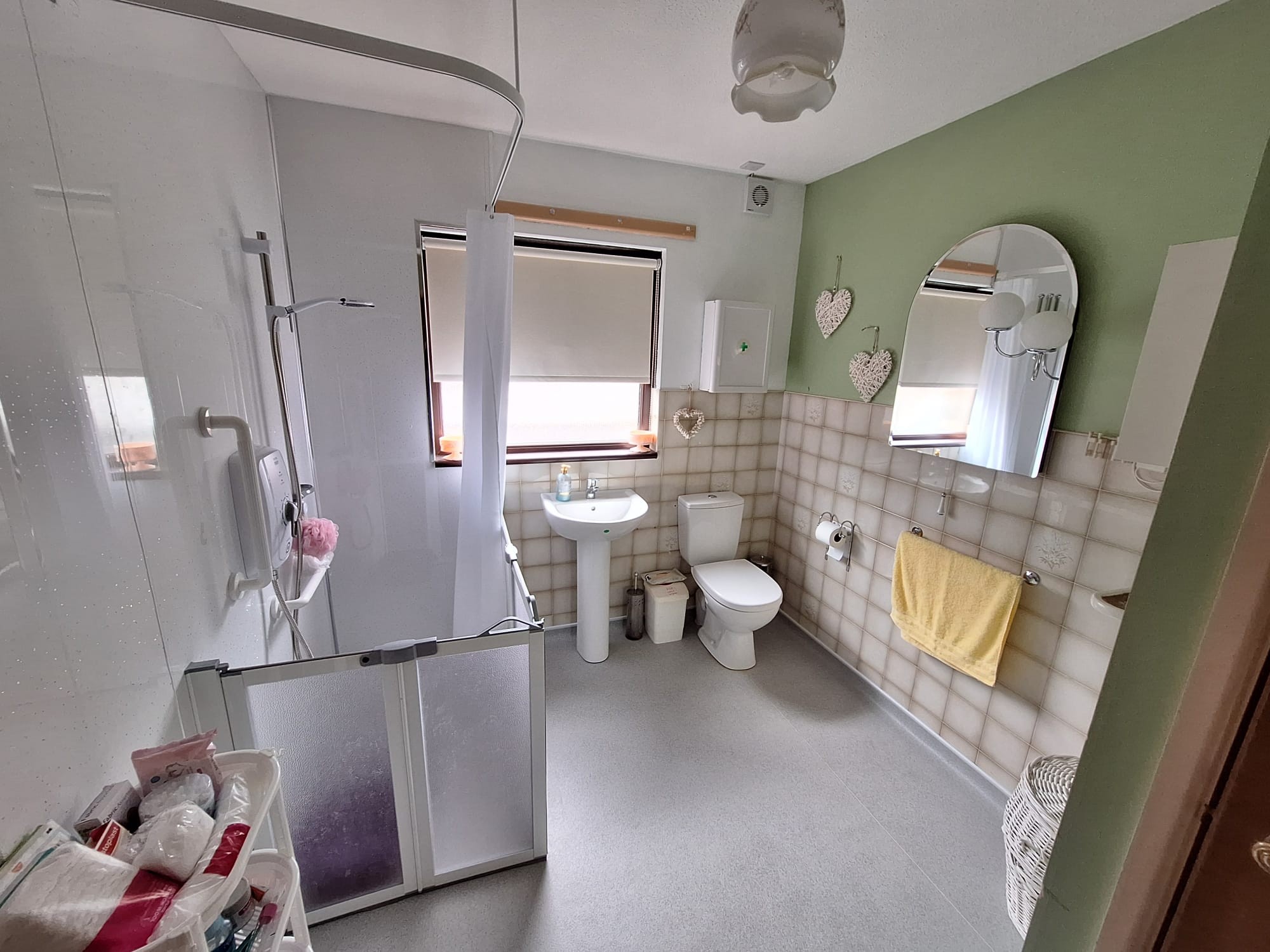 Panelled walk in shower cubicle, "Triton" electric shower, half tiled walls, linen cupboard, WC, wash hand basin, extractor fan.