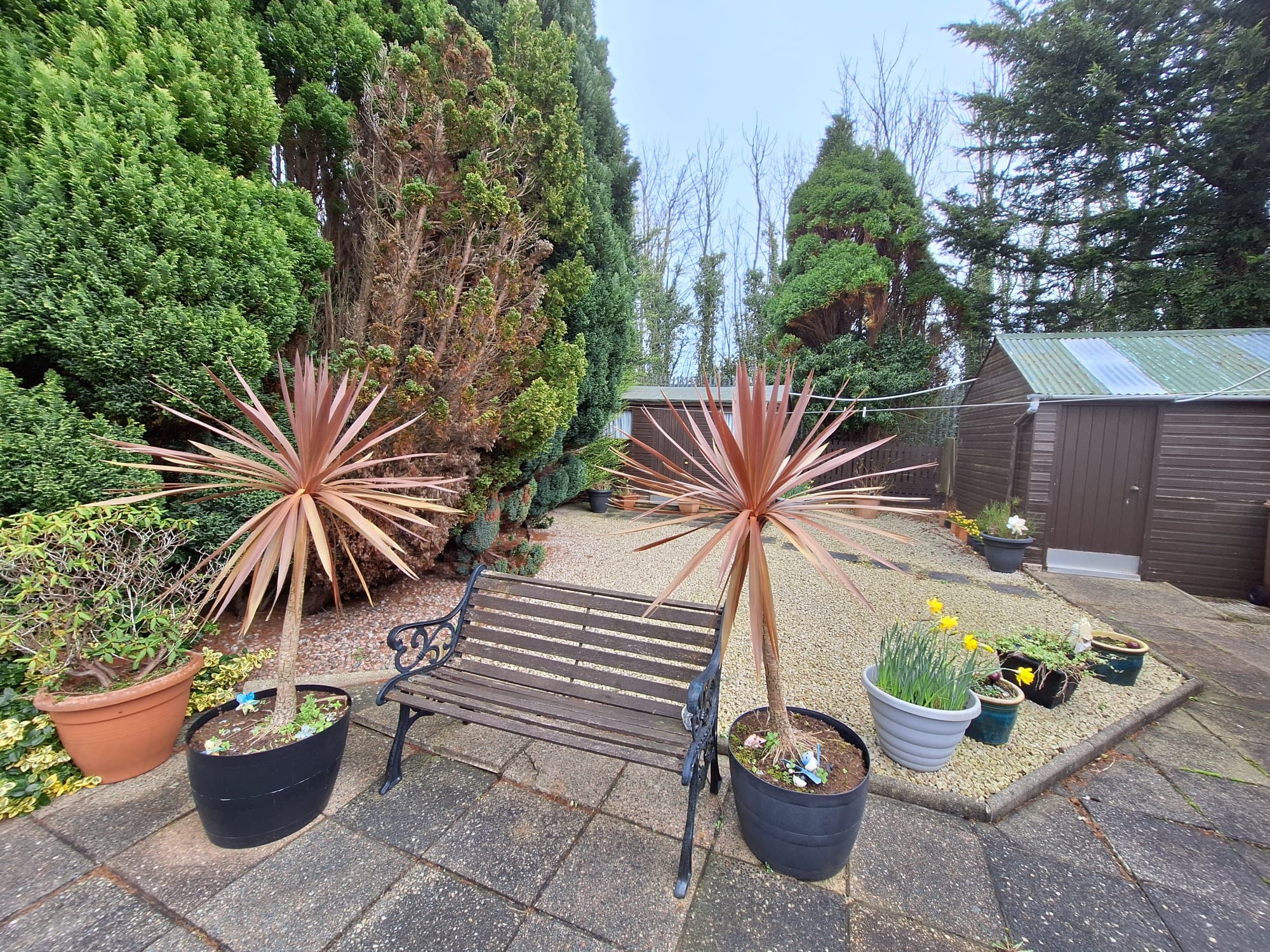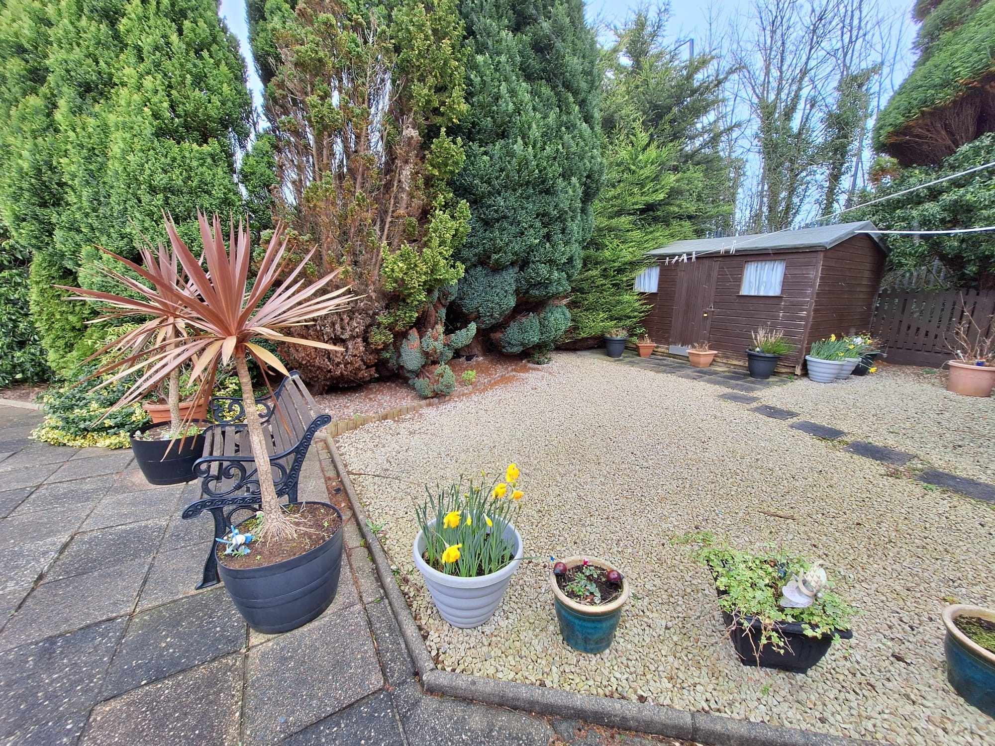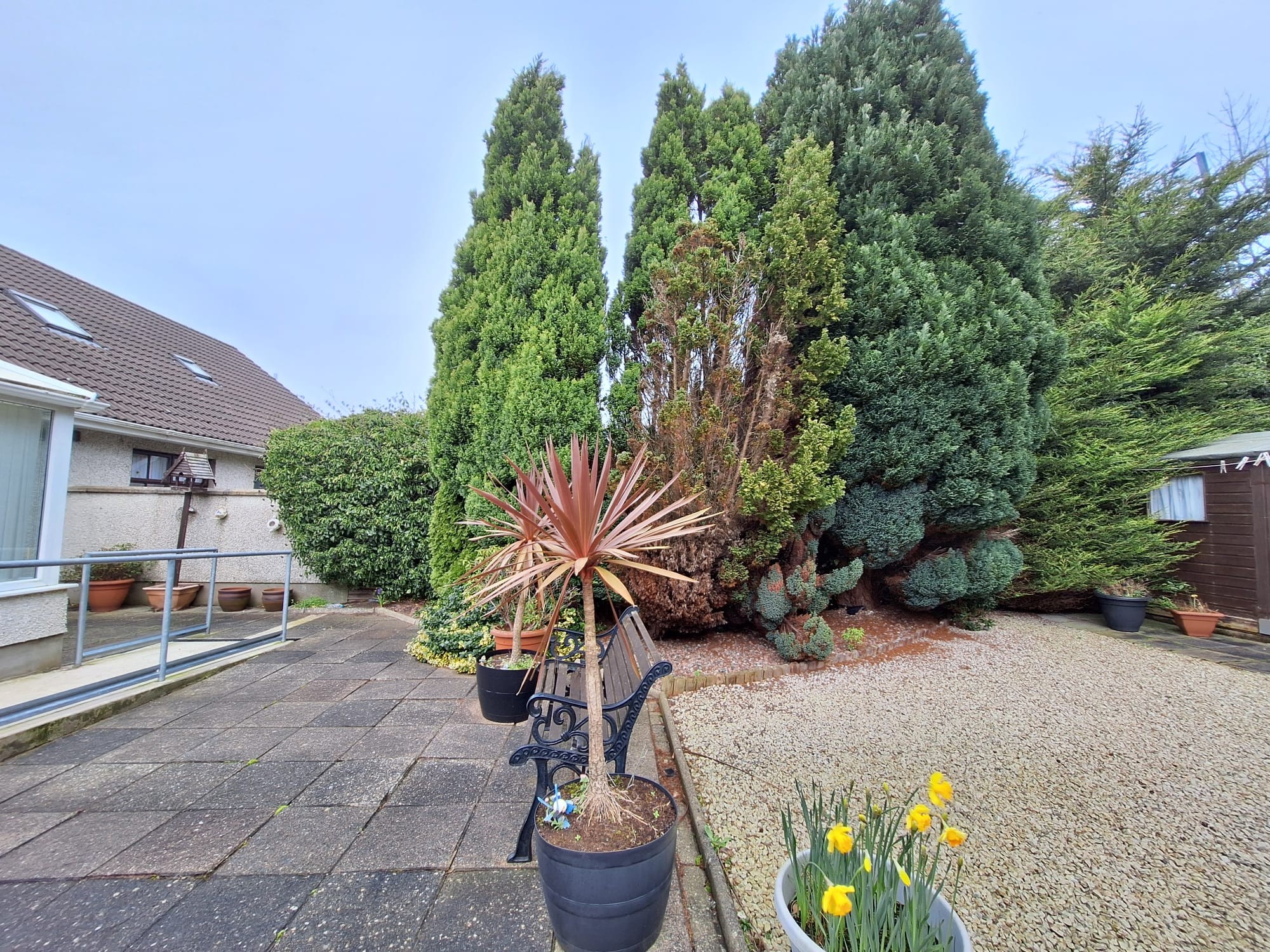 Stoned garden area wall and fence enclosed dotted with conifers, shrubs etc.