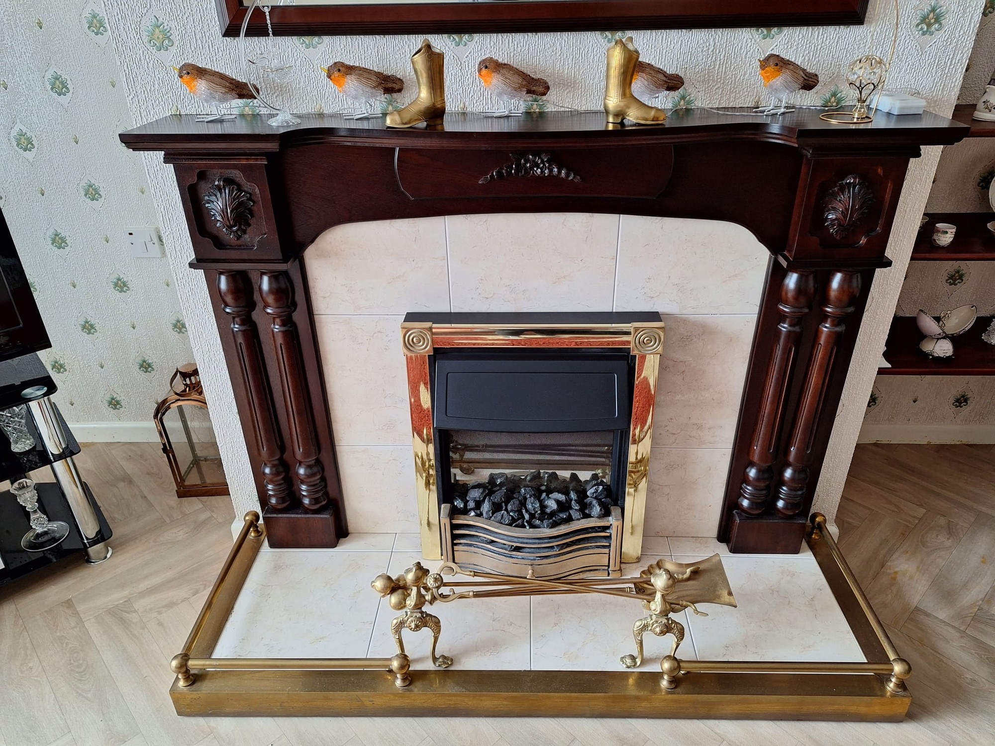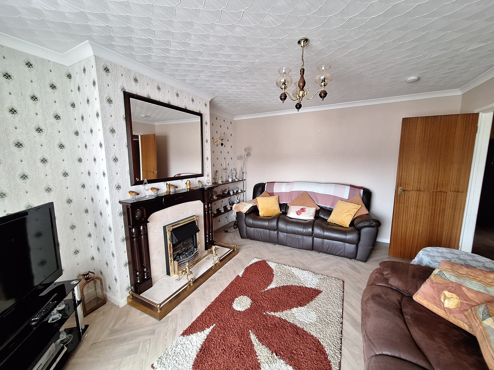 Attractive mahogany fireplace, tiled inset, tiled hearth, points for wall lights, coved ceiling.
