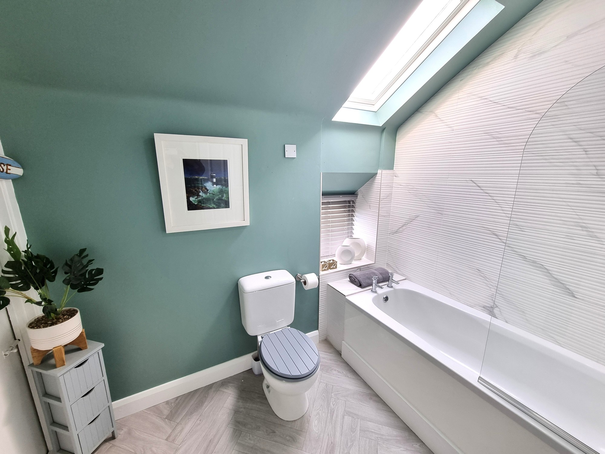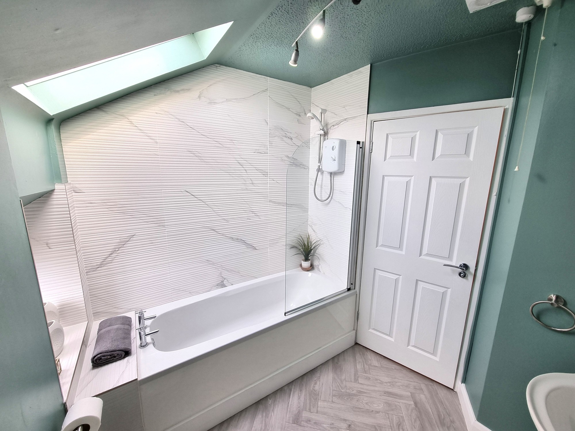Fully tiled around bath, "Triton" electric shower over bath, vanity basin, WC.