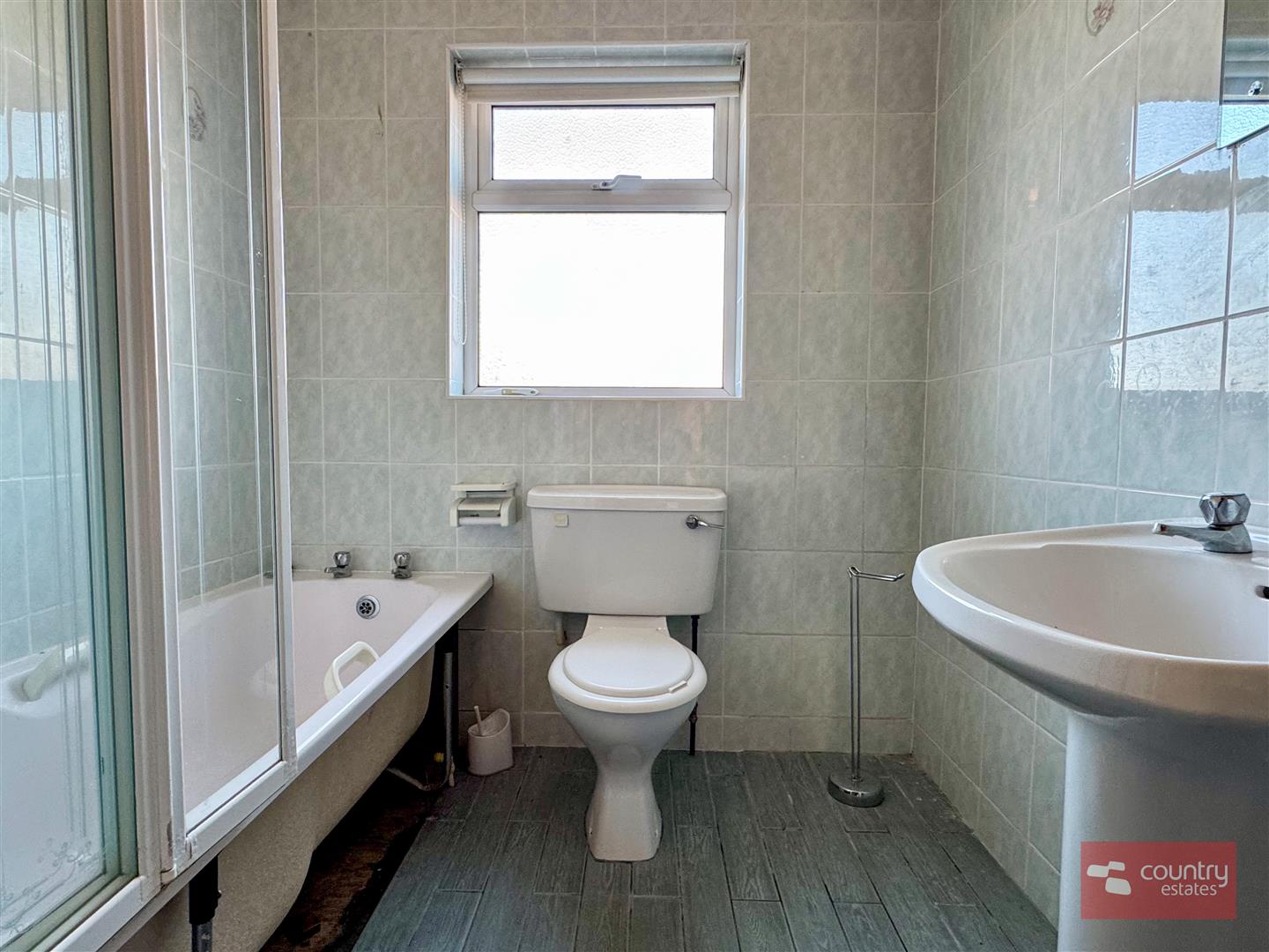 Three piece suite comprising bath with wall mounted electric shower over and fixed folding shower screen, low flush w.c. and pedestal wash hand basin. Shelved hot press. Matching ceramic tile floor.
