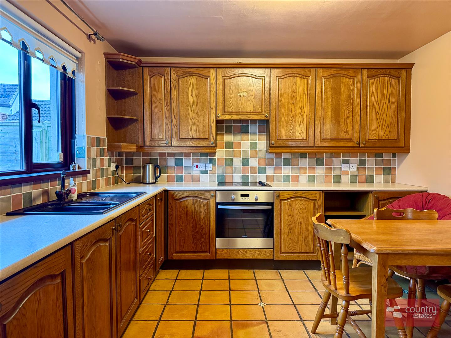 Equipped with a comprehensive range of high and low level oak effect fitted units with contrasting work surfaces and open ended corner displays. Co-ordinating Single drainer sink unit with mixer tap. Integrated oven with 4 ring hob and overhead concealed extractor fan. Part tiled walls. Tiled floor.
