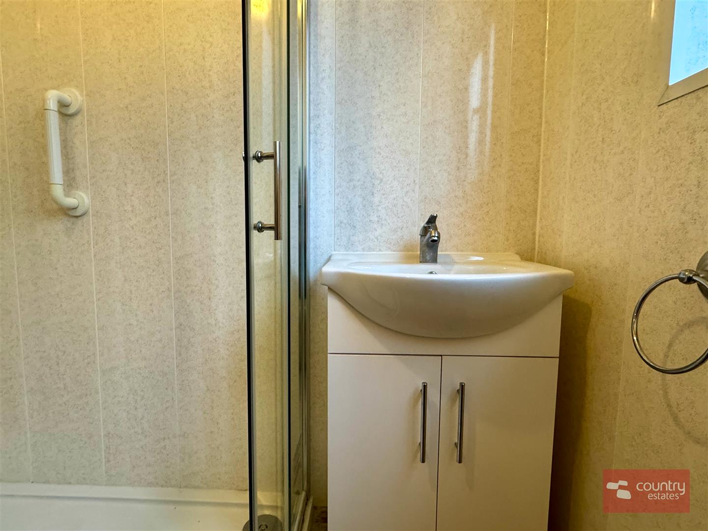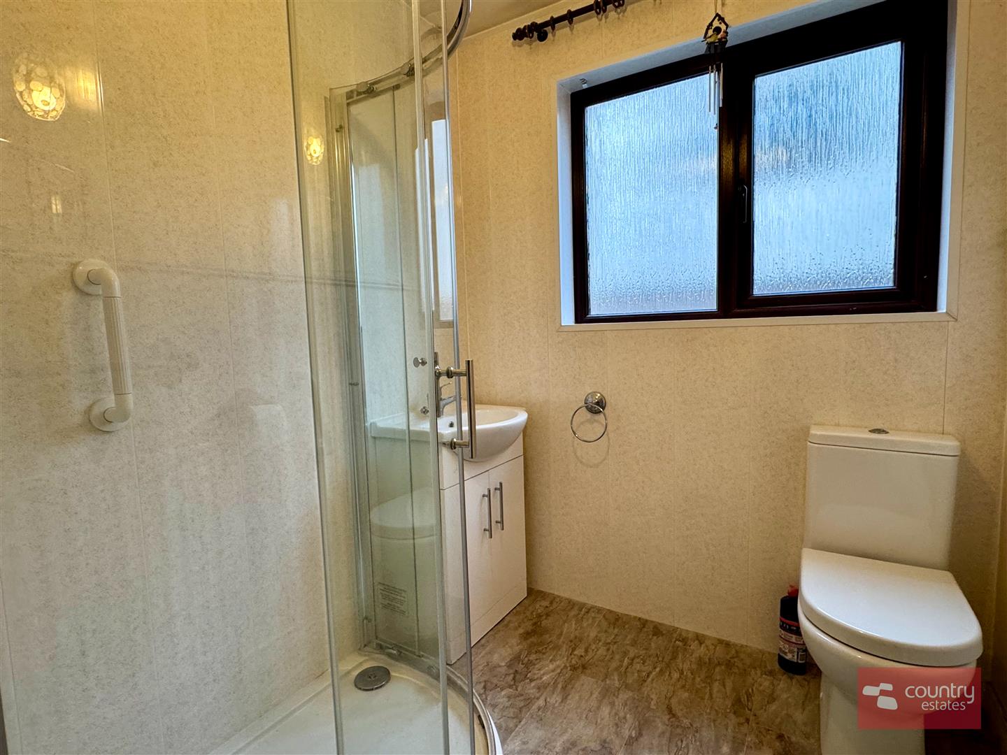 Comprising vanity unit with monobloc tap, button flush WC and large shower enclosure with electric shower unit with PVC panelled walls.