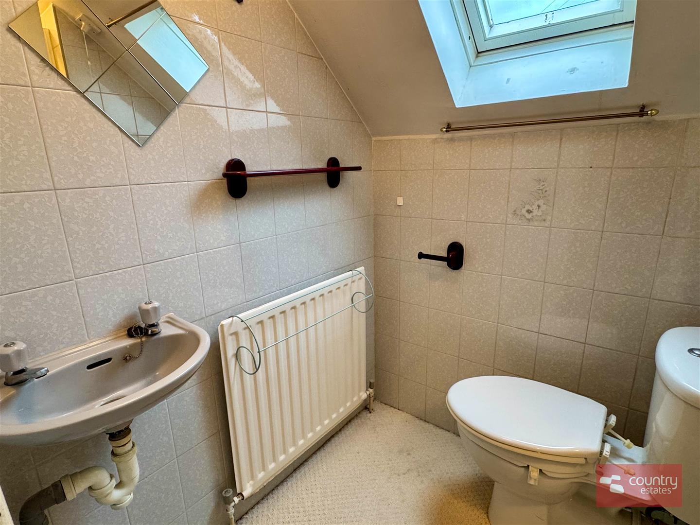 Comprising wash hand basin, button flush WC and shower enclosure. Velux window. Fully tiled walls.