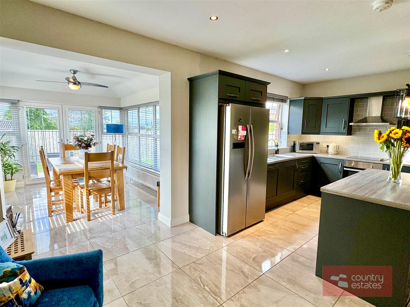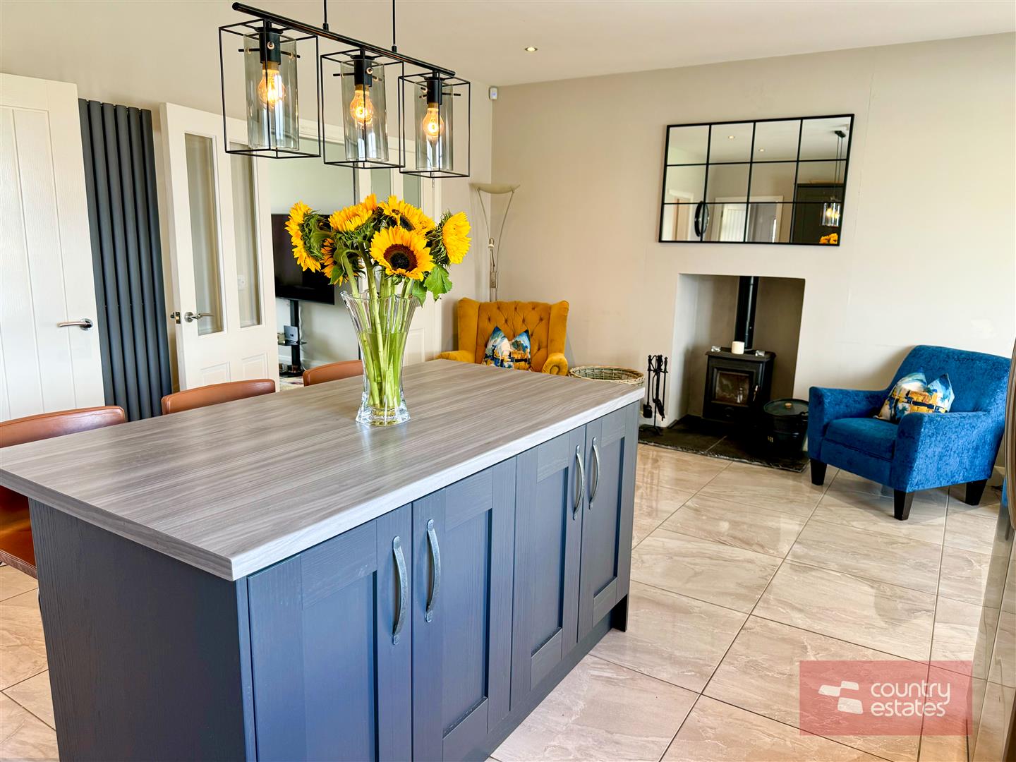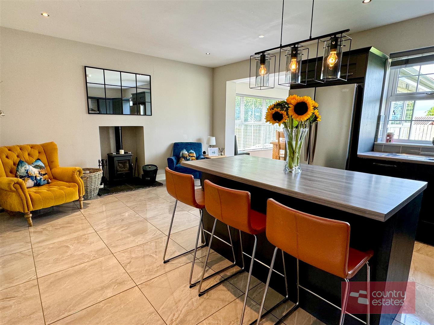 Luxury shaker fitted kitchen in matt grey finish equipped with a comprehensive range of high and low level fitted units with contrasting wood grain effect melamine work surfaces. Matching centre island with breakfast bar style return. Inlaid Stainless steel 1.5 bowl sink unit with swan neck mixer tap. Integrated oven with 4 ring ceramic hob with extractor housed in stainless steel canopy. Integrated dishwasher. Space for free standing American style fridge freezer. Part tiled walls in metro style brick tile. Tiled floor extending into sun room. Inset Cast iron wood burning stove on slate hearth in living / dining area. Open arch leading into: