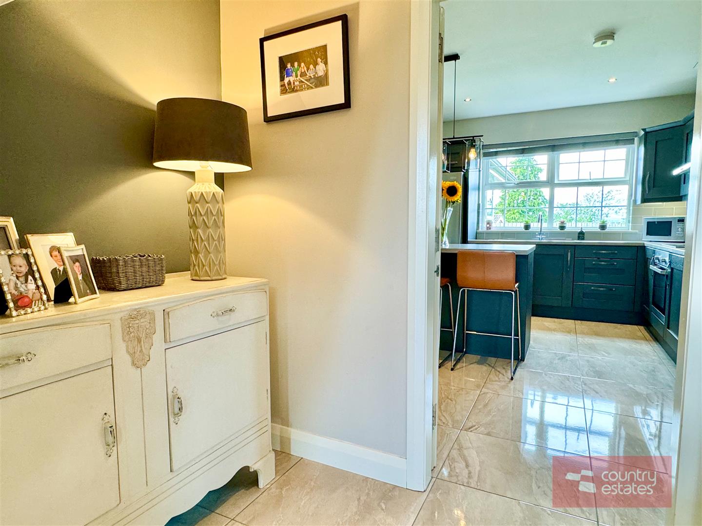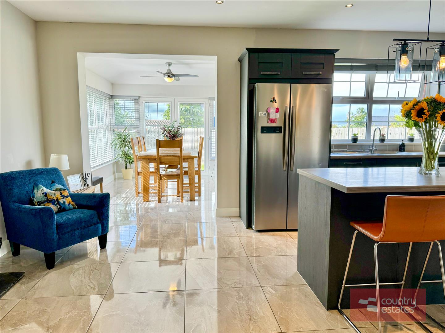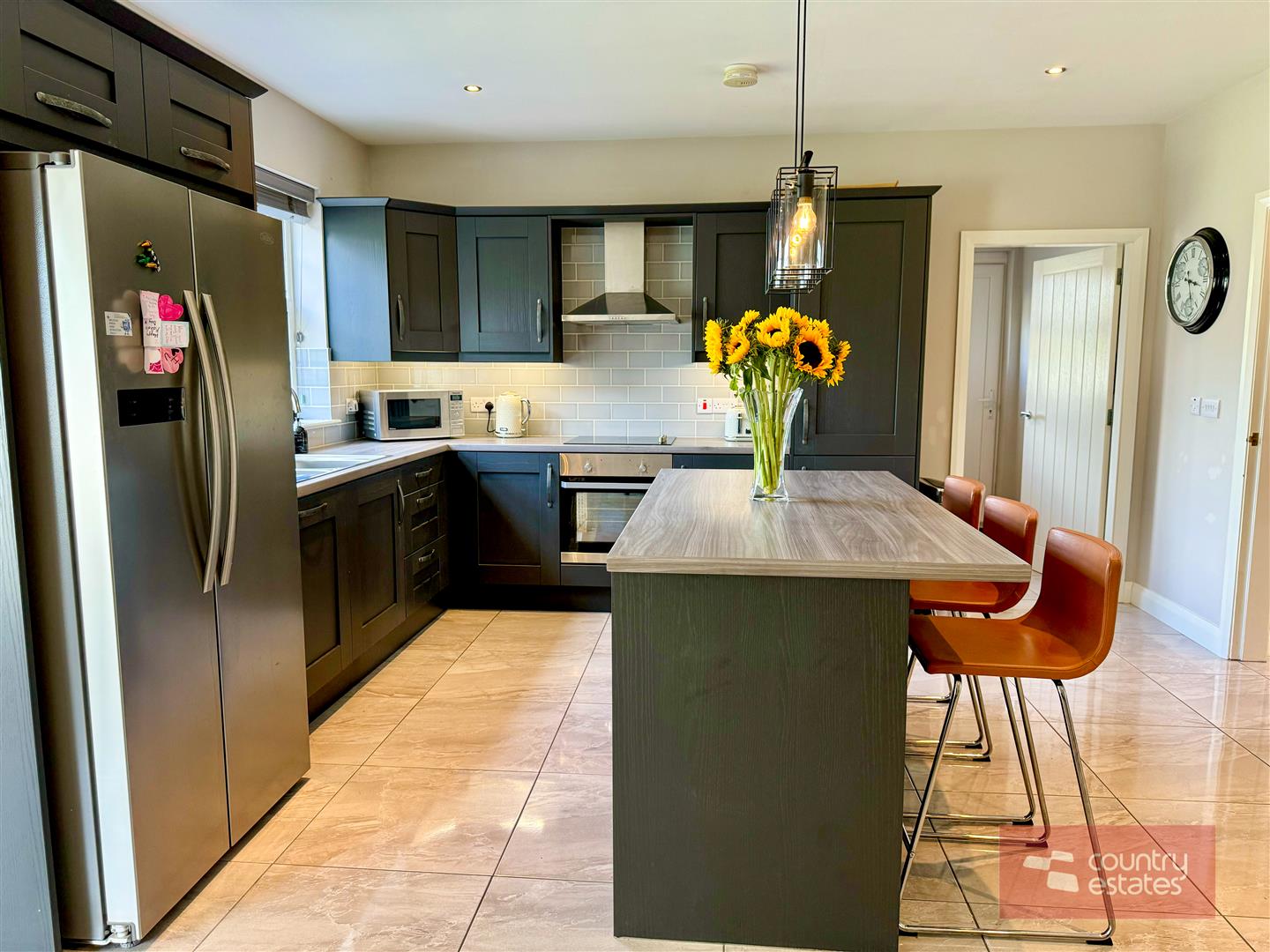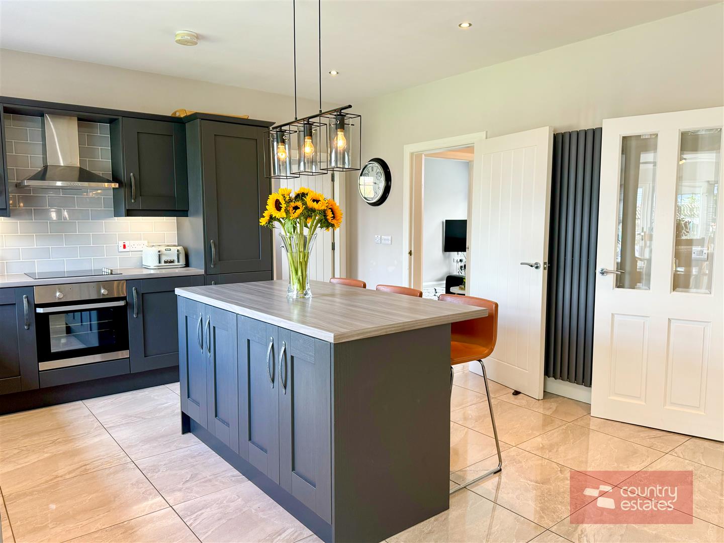 Luxury shaker fitted kitchen in matt grey finish equipped with a comprehensive range of high and low level fitted units with contrasting wood grain effect melamine work surfaces. Matching centre island with breakfast bar style return. Inlaid Stainless steel 1.5 bowl sink unit with swan neck mixer tap. Integrated oven with 4 ring ceramic hob with extractor housed in stainless steel canopy. Integrated dishwasher. Space for free standing American style fridge freezer. Part tiled walls in metro style brick tile. Tiled floor extending into sun room. Inset Cast iron wood burning stove on slate hearth in living / dining area. Open arch leading into: