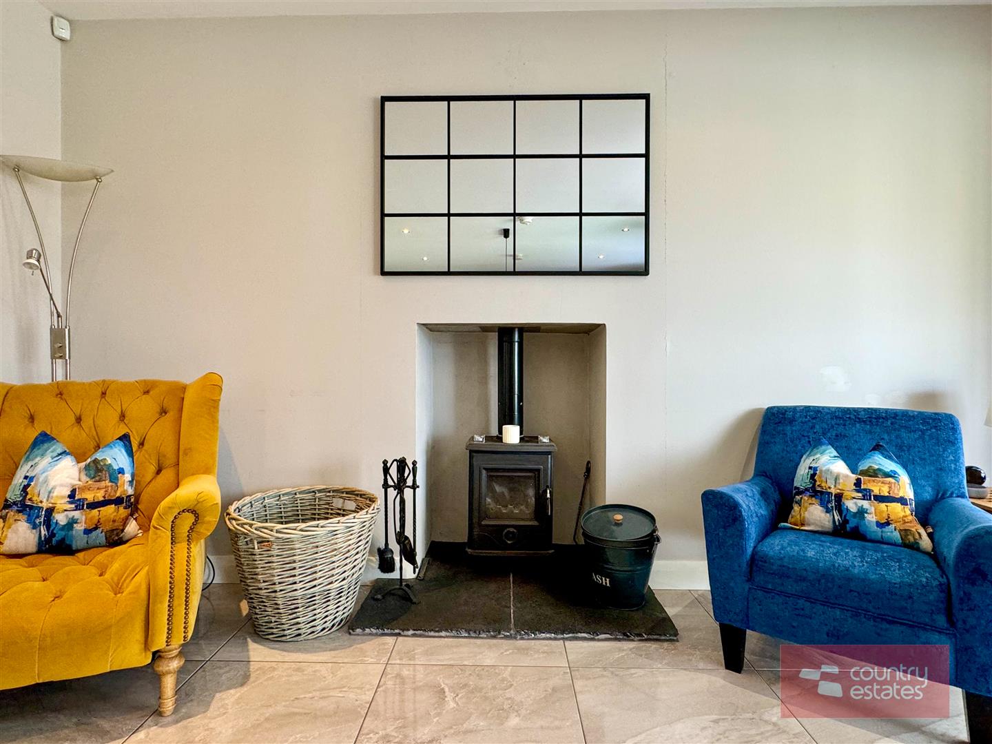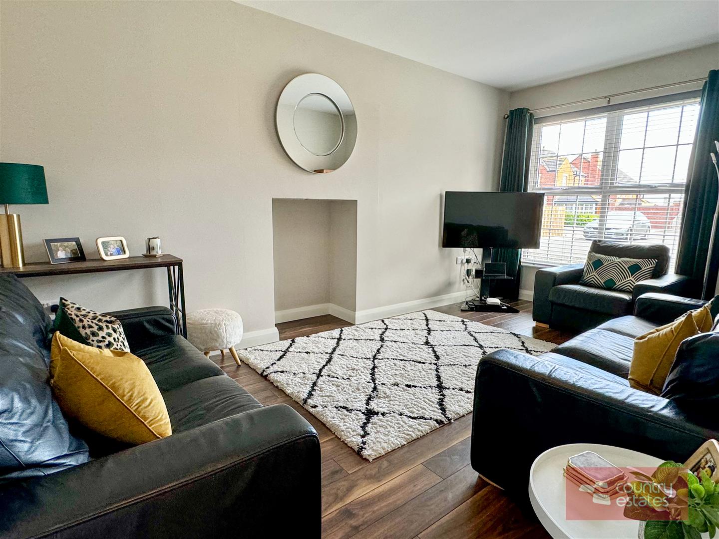 Inglenook recess for stove. Picture window to front elevation. Quality walnut effect laminate plank flooring.