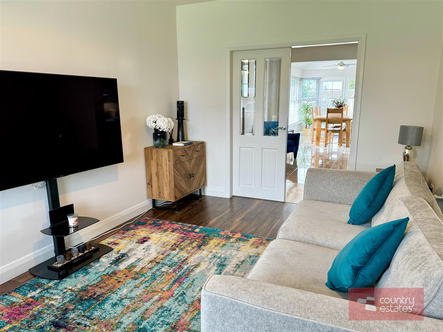 Picture window to front elevation. Quality walnut effect laminate plank flooring. Twin glass panelled French doors leading to: