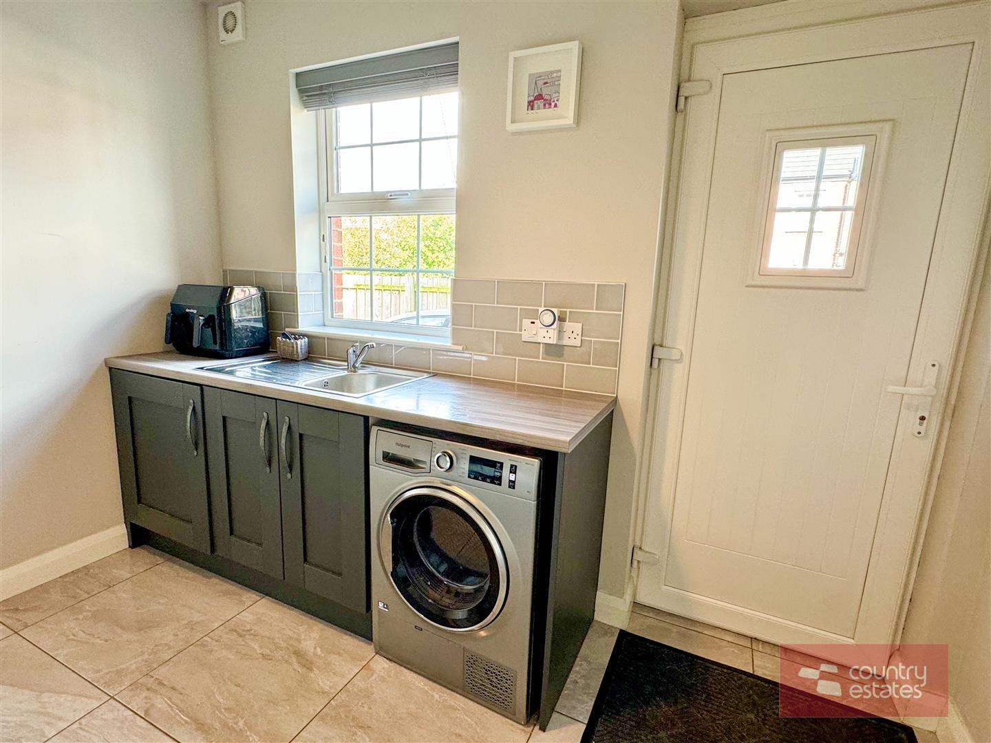 Modern range of fitted low level shaker style matching units. Integrated washing machine. Space for tumble dryer. Splash back tiling to walls in metro style brick. Tiled floor. PVC double glazed back door.