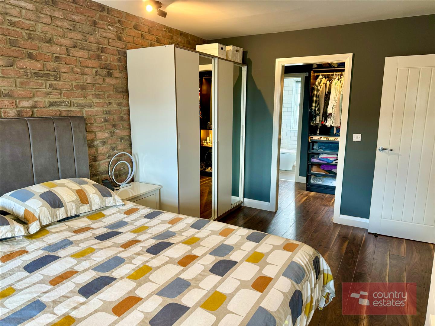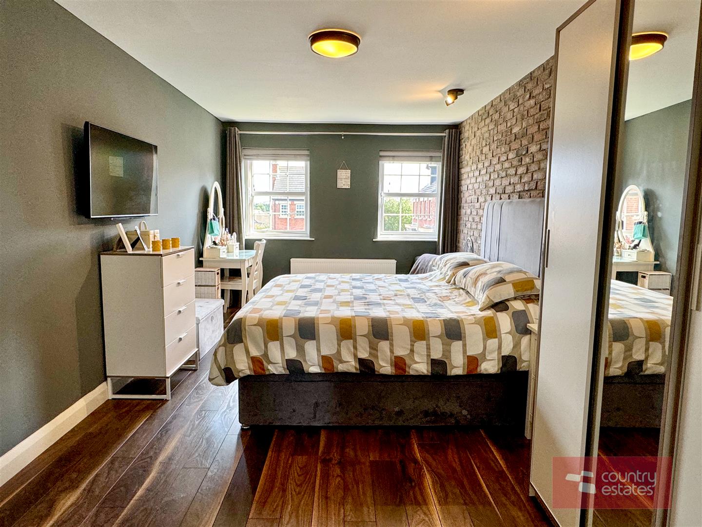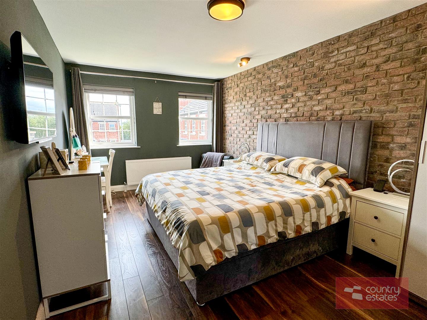 Exposed brick feature accent wall. Quality wood effect laminate flooring. Dual window aspect. Open through to:
