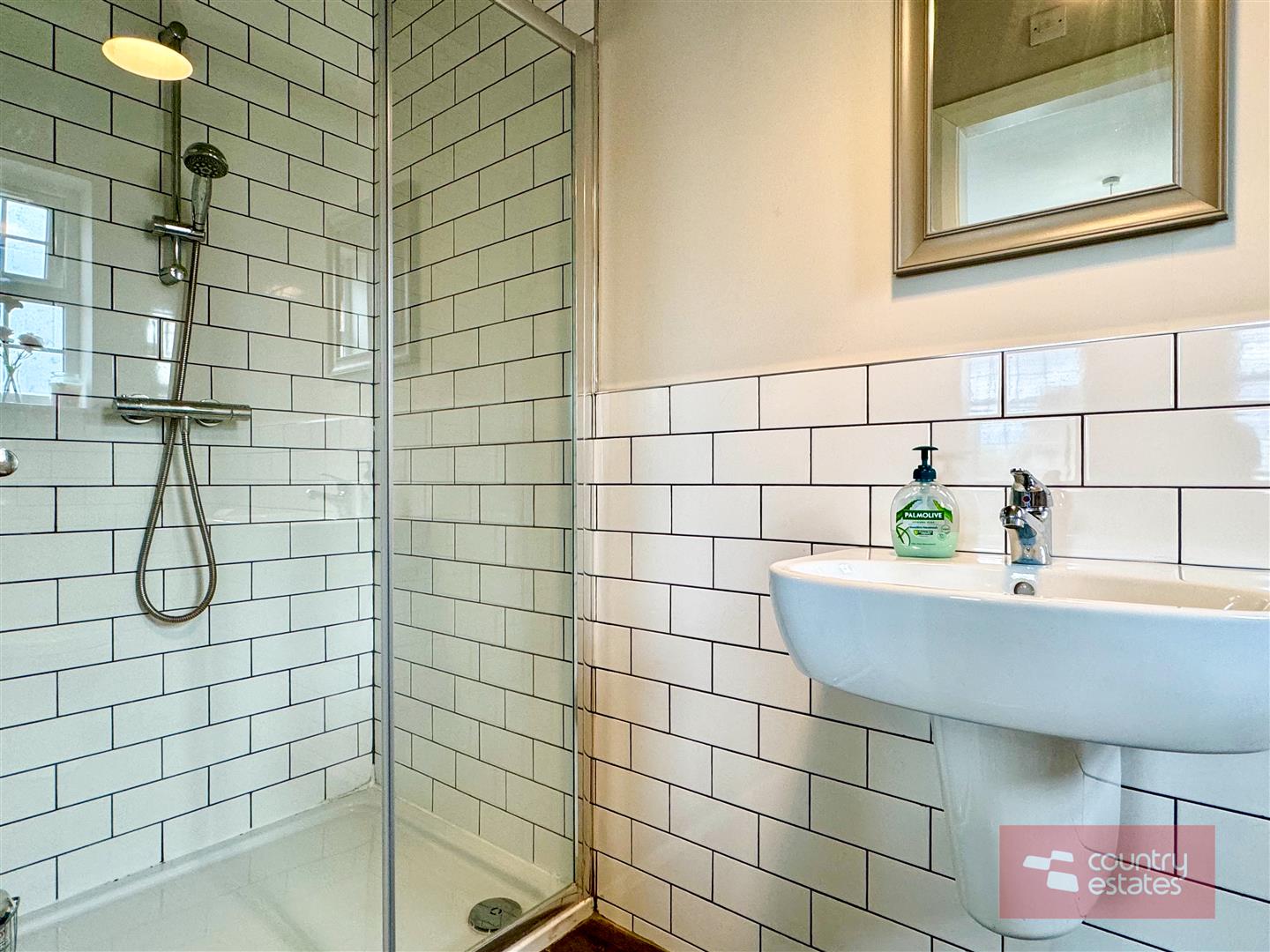 Contemporary white three piece suite comprising shower enclosure, semi pedestal wash hand basin with monobloc tap and WC. Half tiling to walls. Tiled floor. Walk in fully tiled shower enclosure with thermostatically controlled mains shower (pressurised system).
