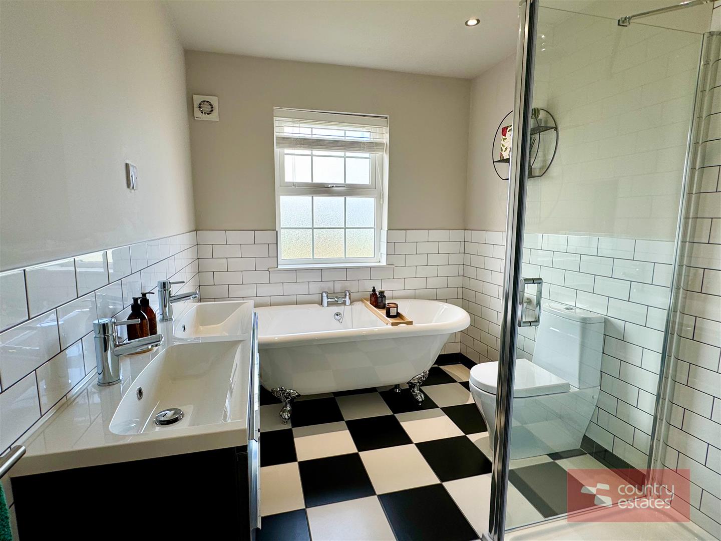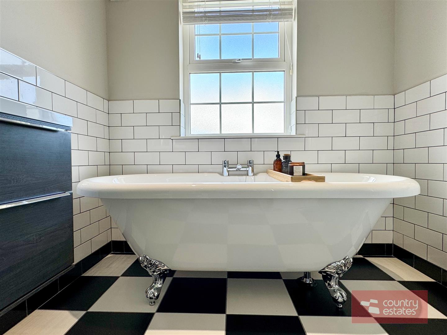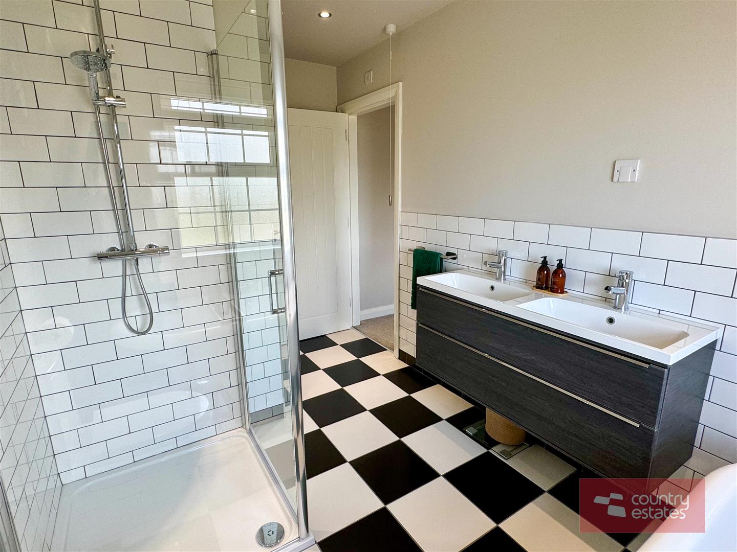 White four piece suite comprising freestanding roll top ball and claw bath, separate fully tiled shower enclosure with drench style shower, floating vanity unit with twin 'his and hers' sinks and WC. Thermostat controlled mains shower unit (pressurised system). Checker board tiled floor. Half tiling to walls. Access to hot press.