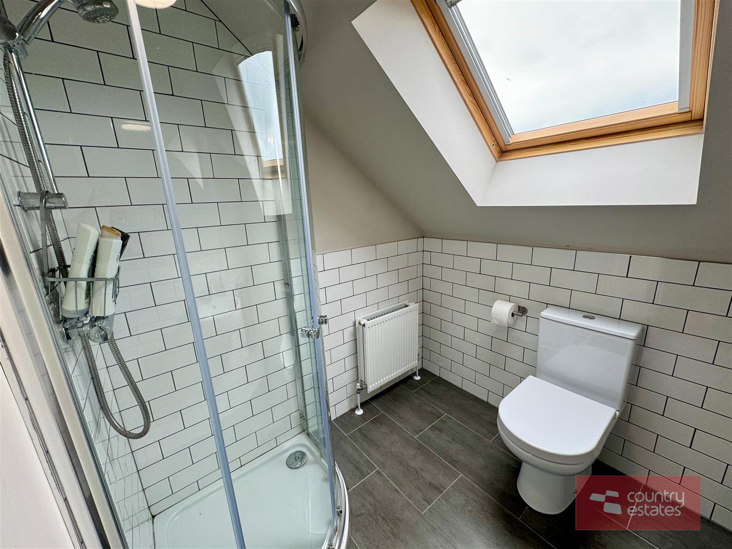 Contemporary white three piece suite comprising fully tiled quarter rounded shower enclosure, semi pedestal wash hand basin and WC. Thermostatically controlled shower (pressurised system). Half tiling to walls in metro brick tile. Tiled floor. Keylite skylight.