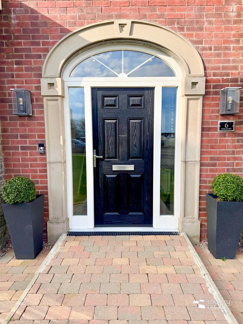 Composite panelled front door with hardwood double glazed sidelights and fan light over. Tiled floor. Feature height ceilings.