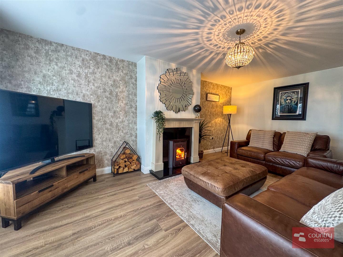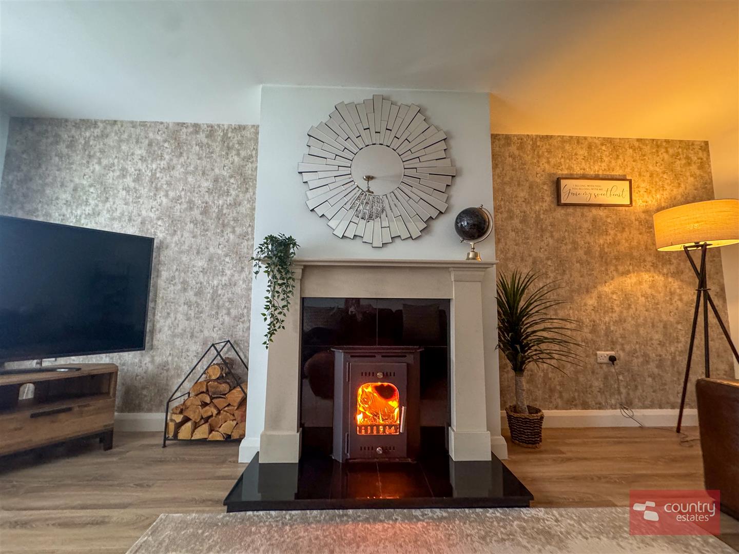 Attractive marble fireplace with polished granite inset and matching hearth with wood burning stove. Dual window aspect. Laminate floor.