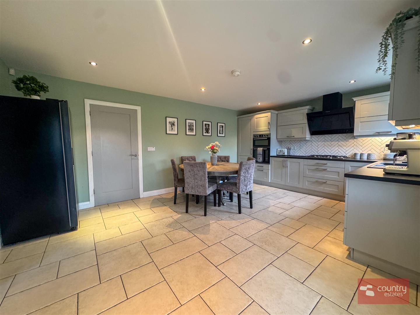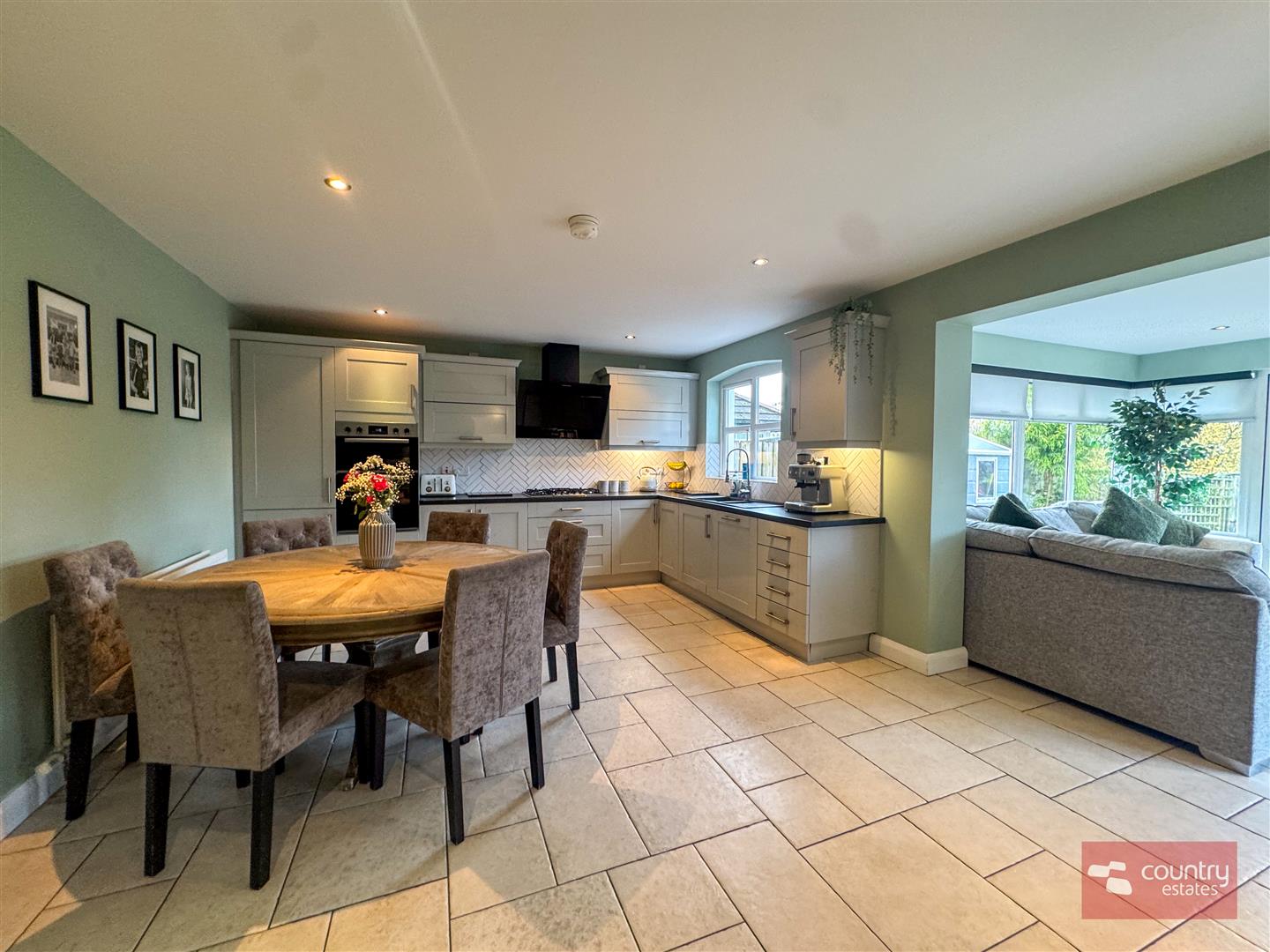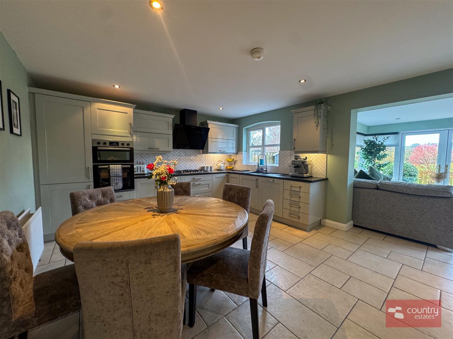 Equipped with a comprehensive range of high and low level shaker style units with contrasting work surfaces. One and half drainer sink unit with mixer taps. A host of integrated appliances including eye level microwave and recently installed oven, separate 5 ring gas hob and overhead extractor fan housed in stainless steel canopy with glass hood, dishwasher and space for integrated fridge/freezer. Complementary wall tiling. Tiled floor extending into:-