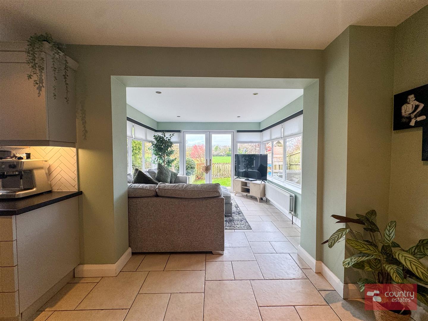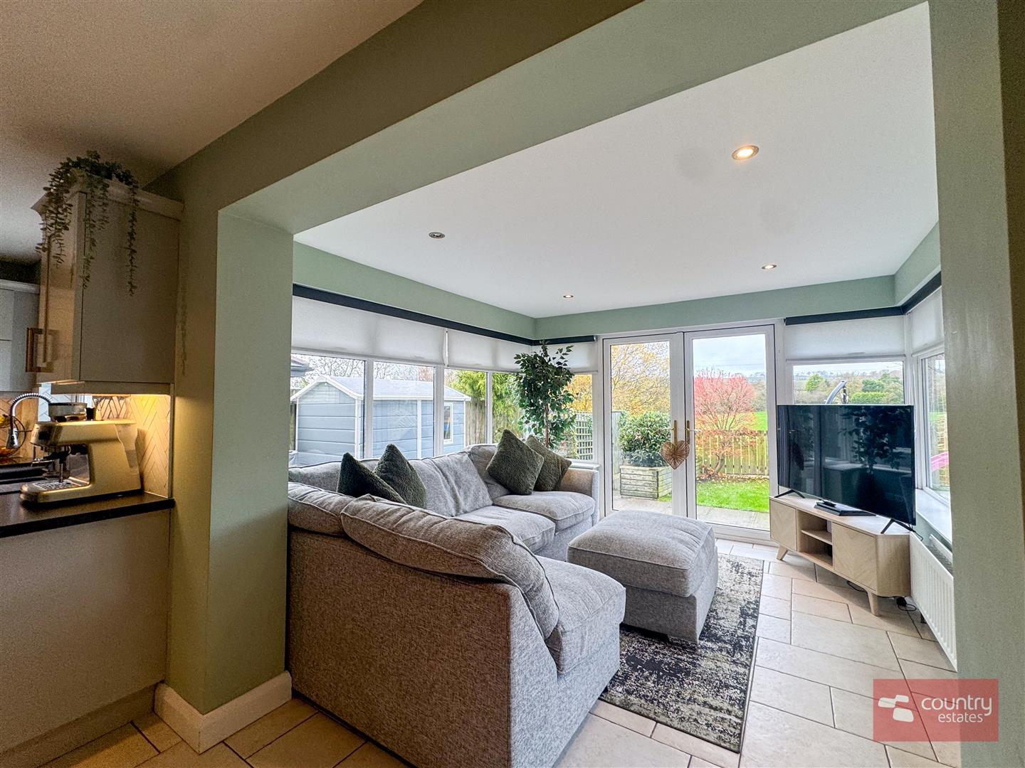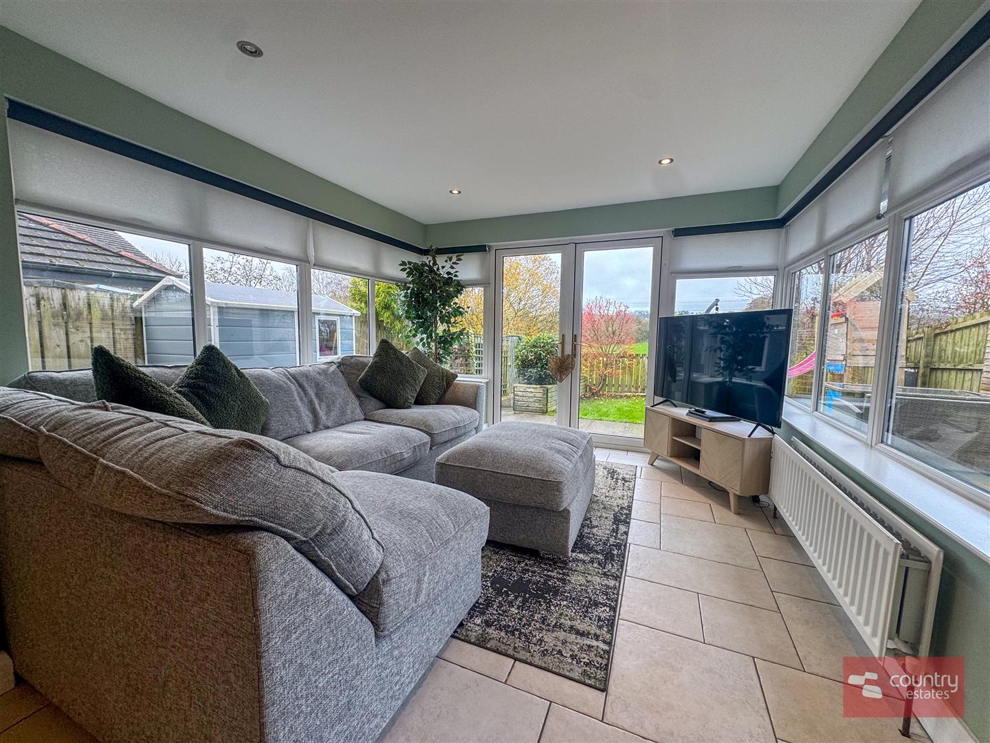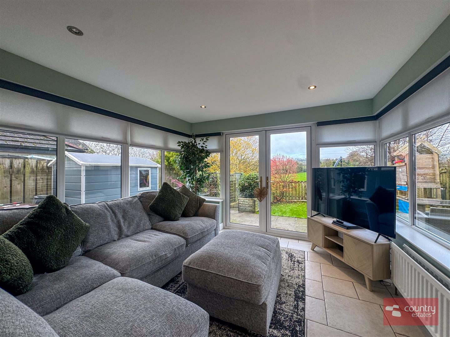 Twin PVC double glazed door to garden. Enjoys far reaching rural views.