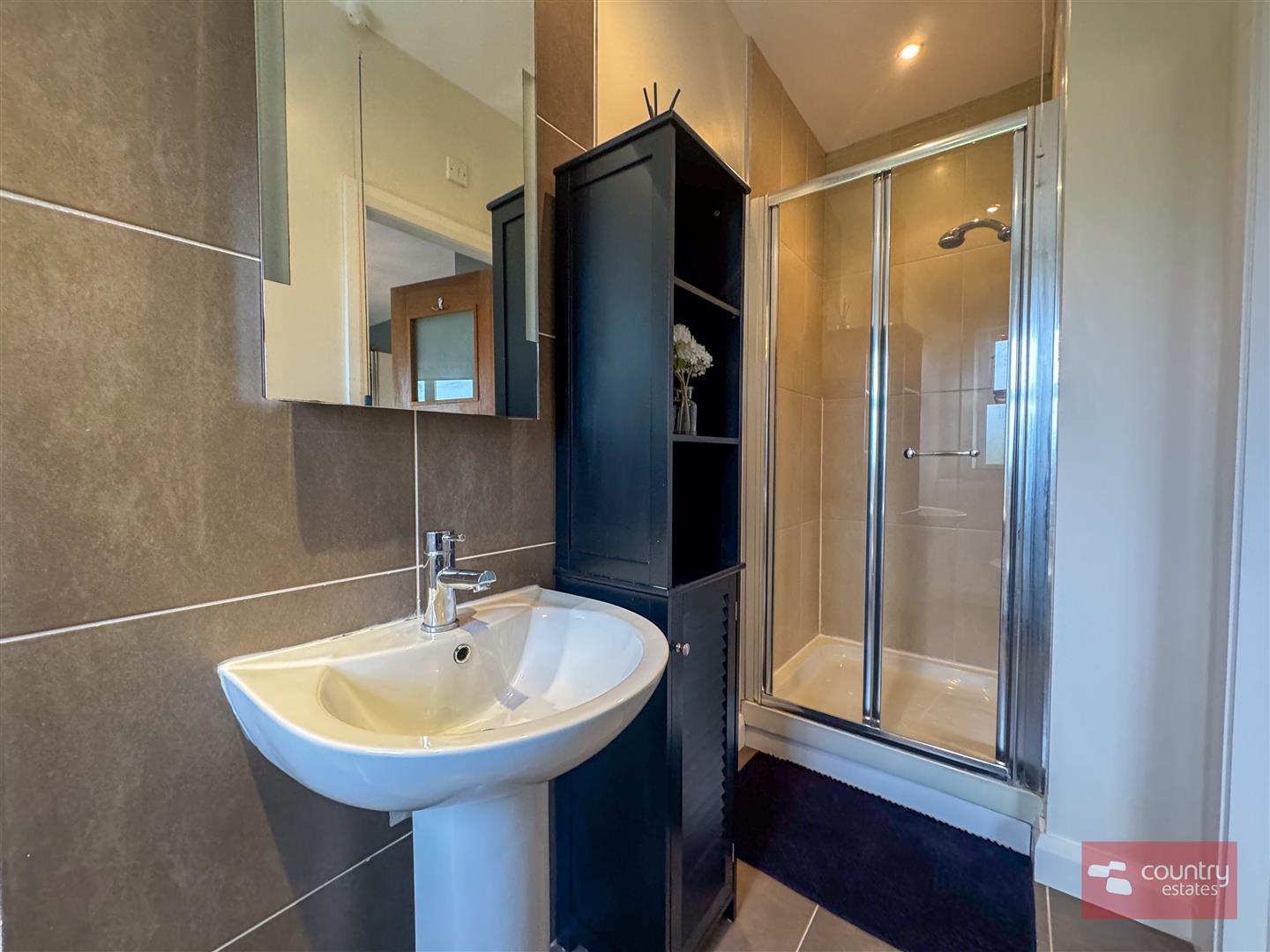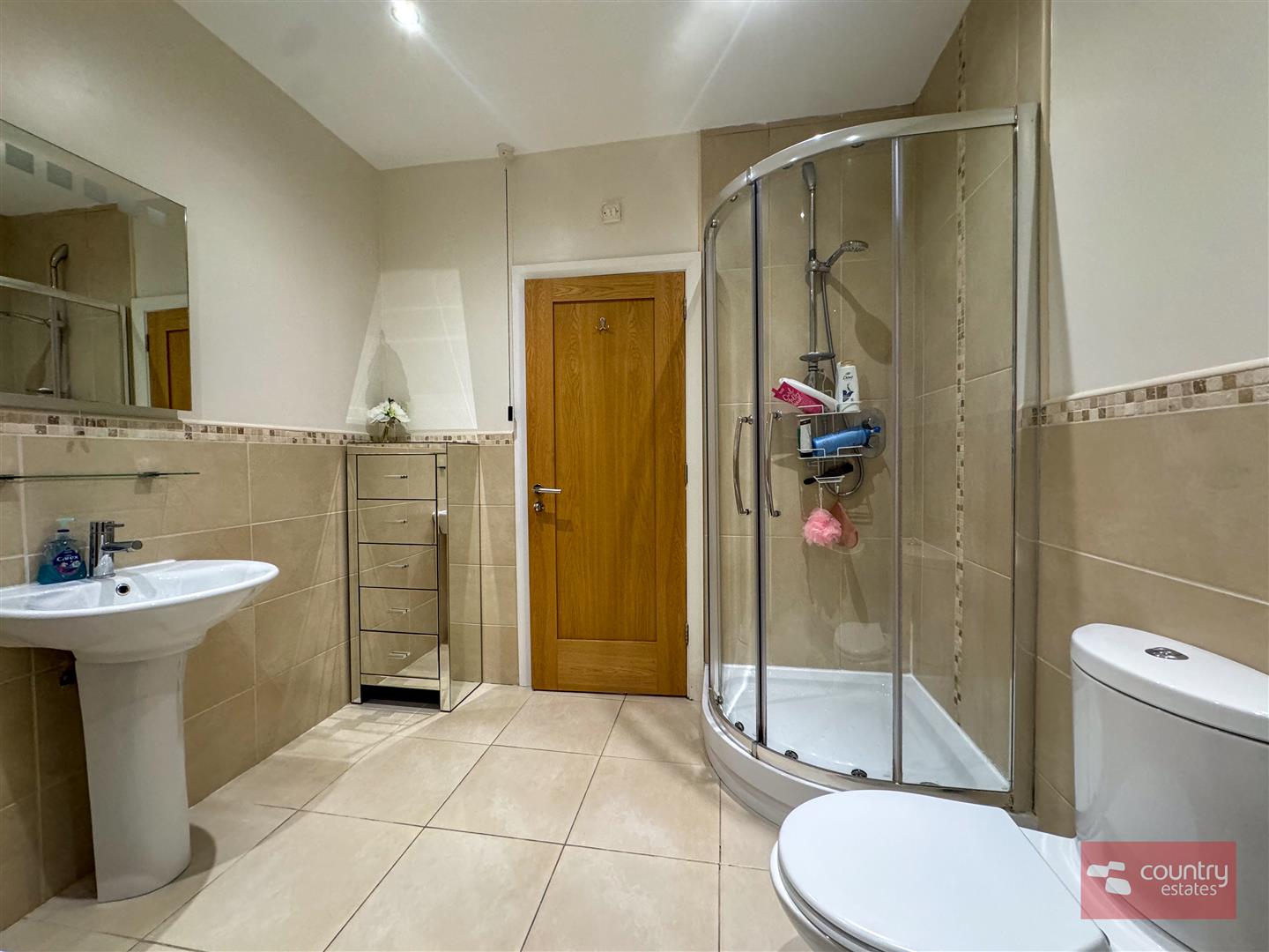 Comprising fully tiled shower cubicle, pedestal wash hand basin with feature tiled accent panel and button flush w.c. Tiled floor. Low voltage lighting.