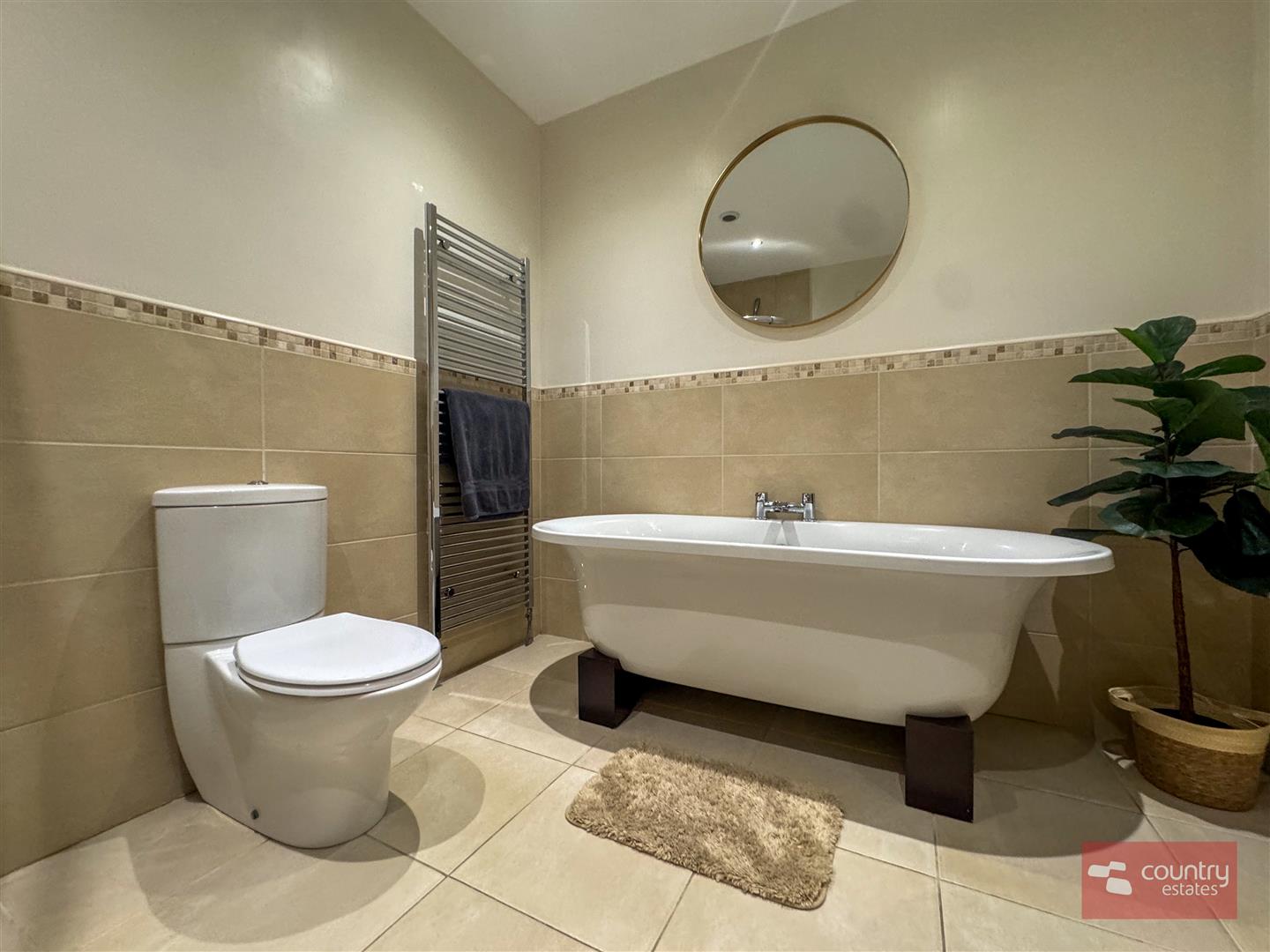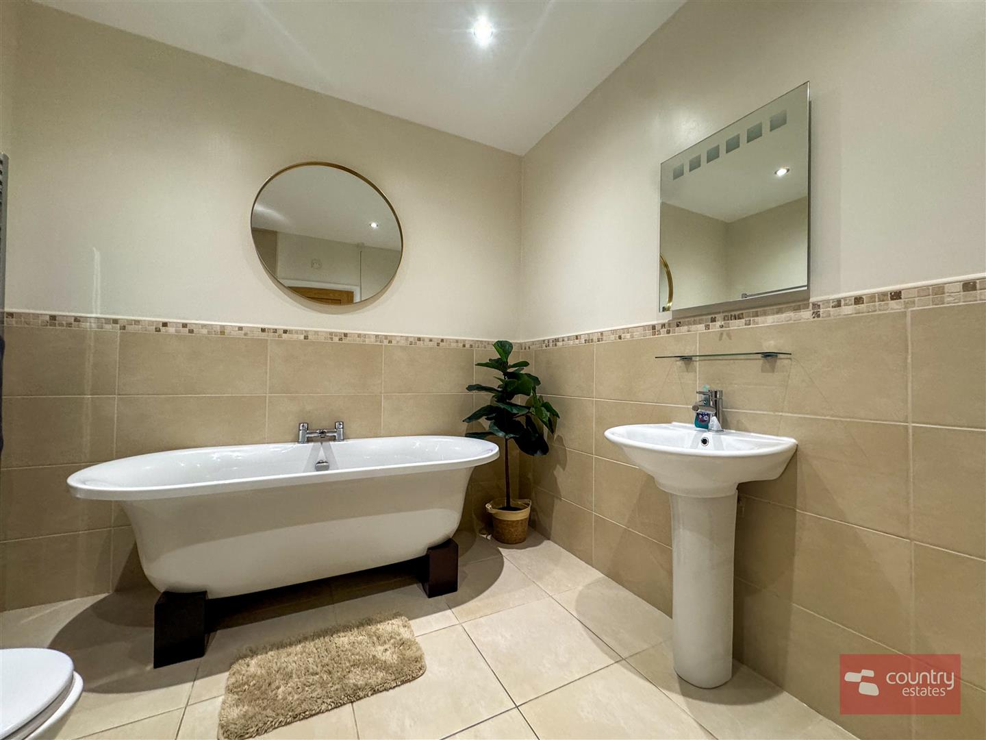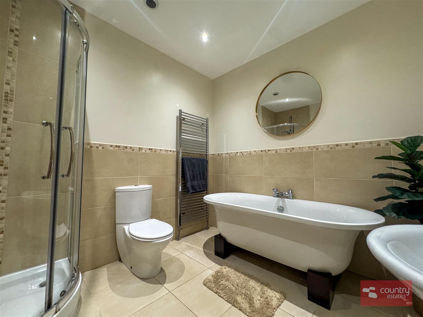 Comprising pedestal wash hand basin with mono block tap, button flush w.c, freestanding roll top bath and quarter rounded shower cubicle. Tiled floor. Half tiled walls.