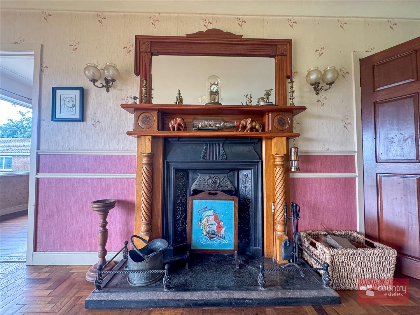 Attractive wooden fireplace with open fire and cast iron surround with matching built in mirror above. Duel wall lighting. Coved ceiling. Decorative dado rail. Solid wood floor. PVC Double glazed sliding patio doors onto rear garden. Views over garden and beyond. Open plan into:-