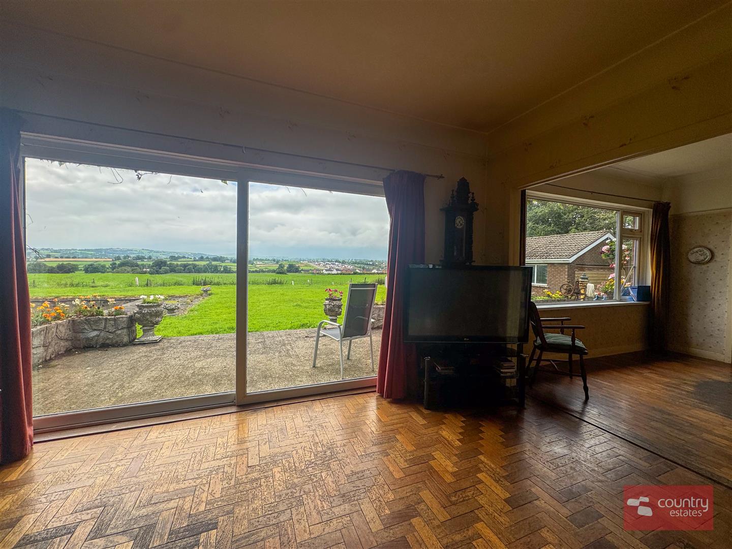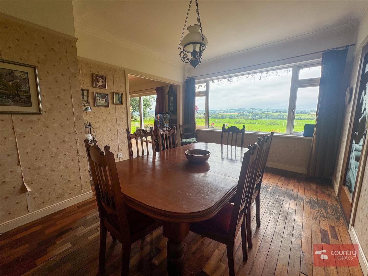 Solid wood floor. Views over garden and beyond.